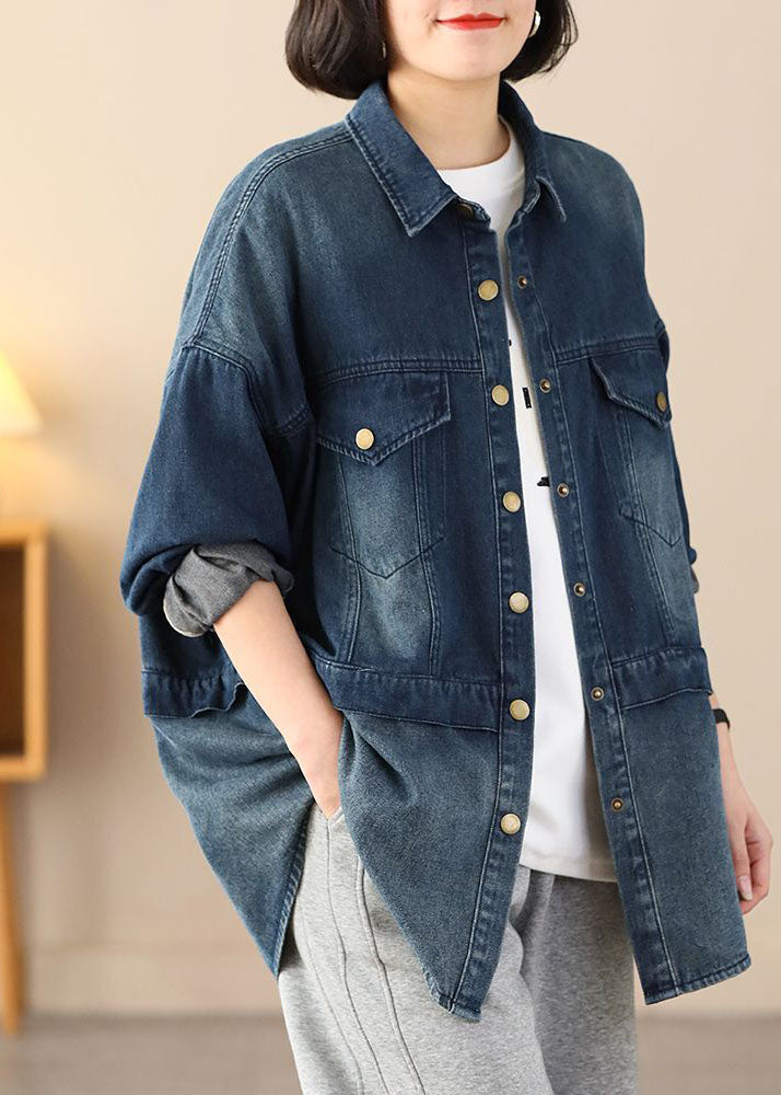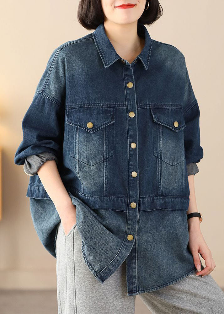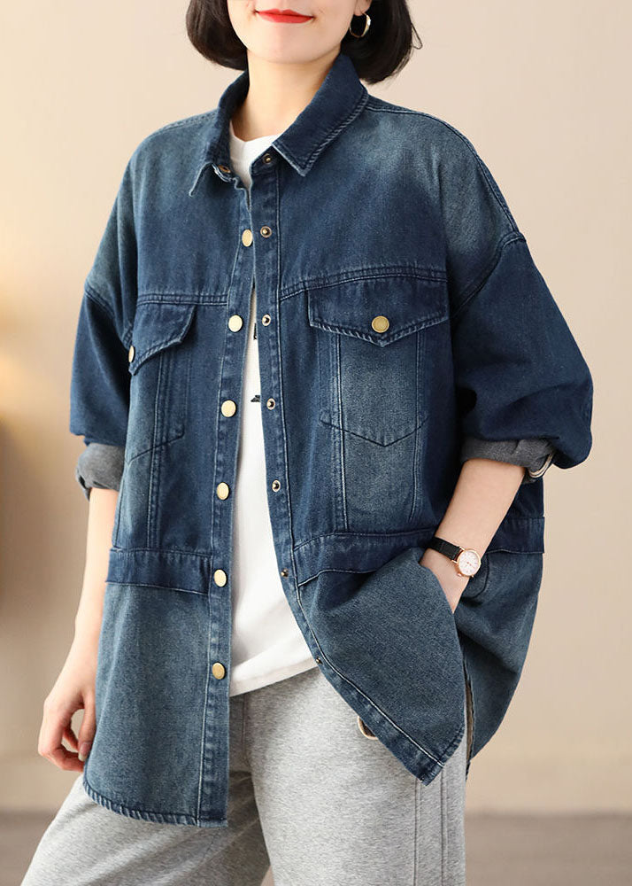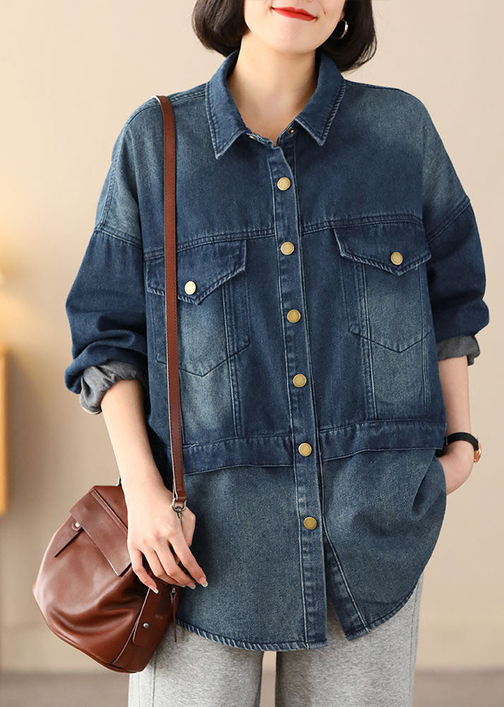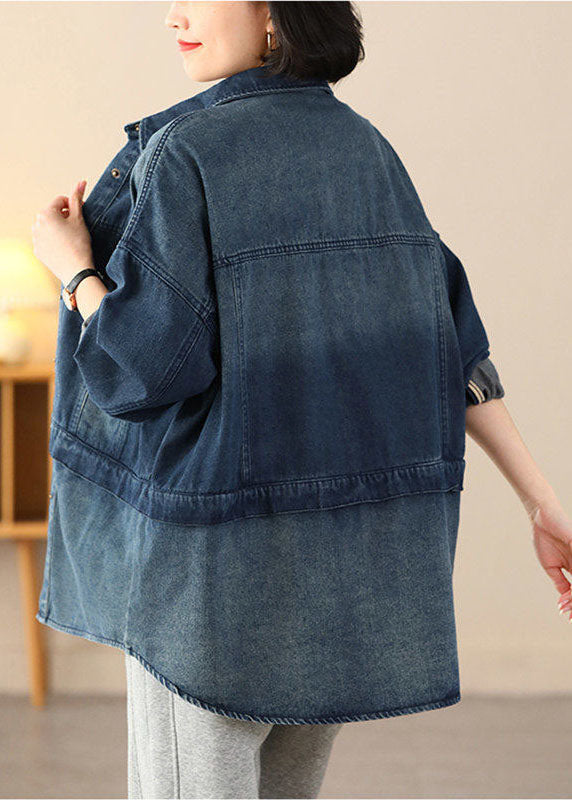 Organic Blue Oversized Patchwork Pockets Cotton Denim Coats Spring