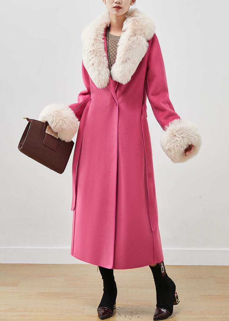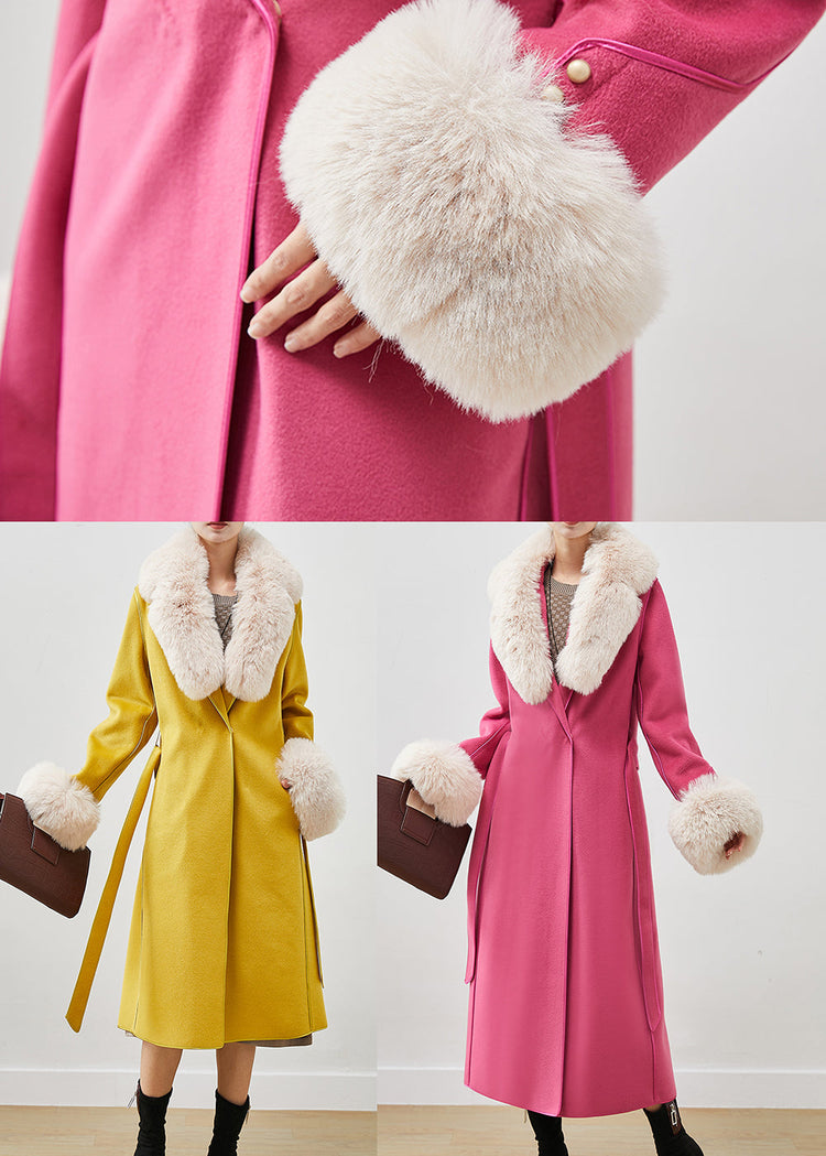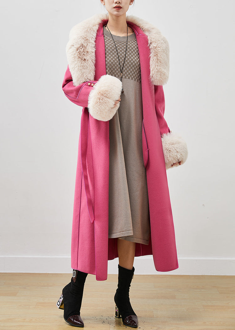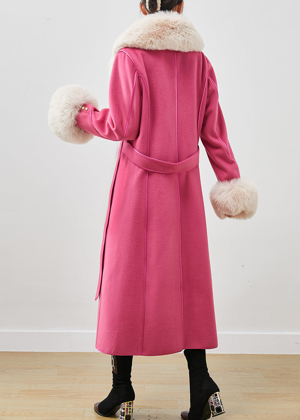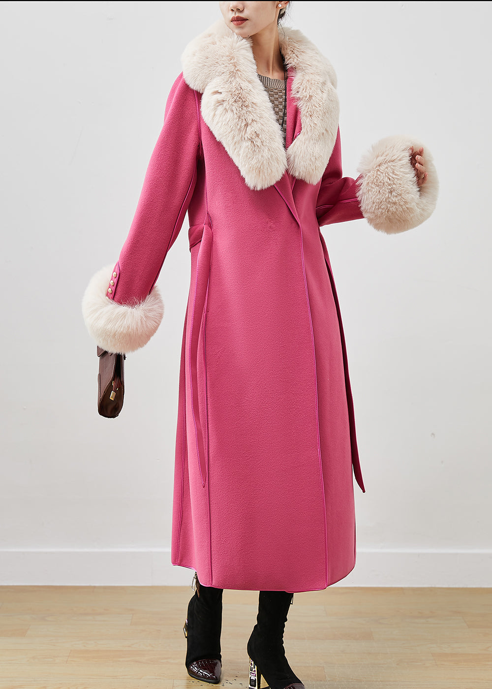 Pink Silm Fit Woolen Coat Outwear Fur Collar Tie Waist Fall