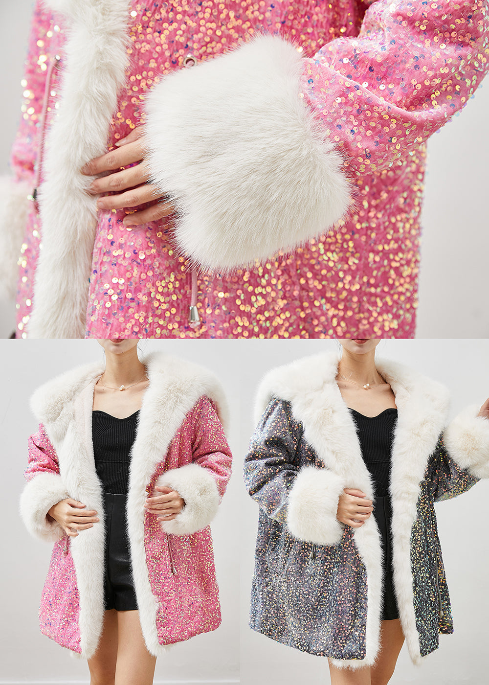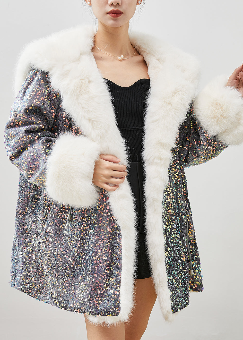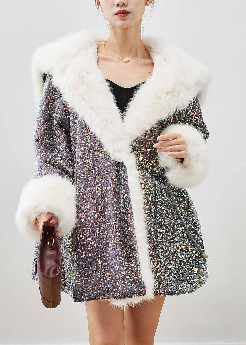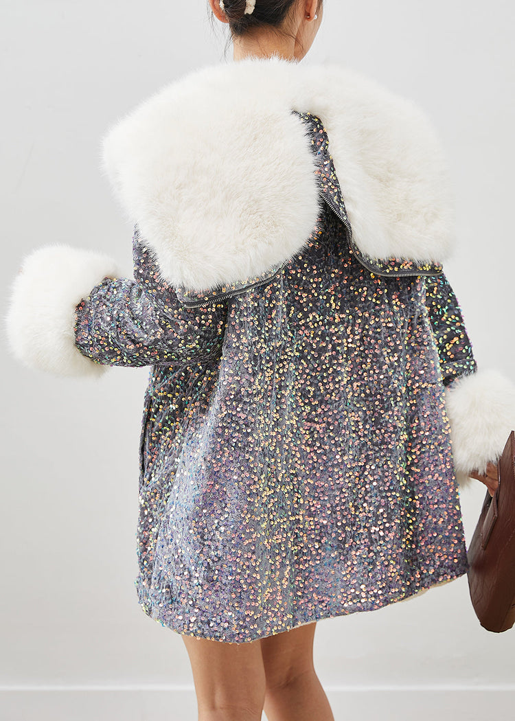 Plus Size Grey Sequins Warm Faux Fur Velour Hoodie Coat Winter