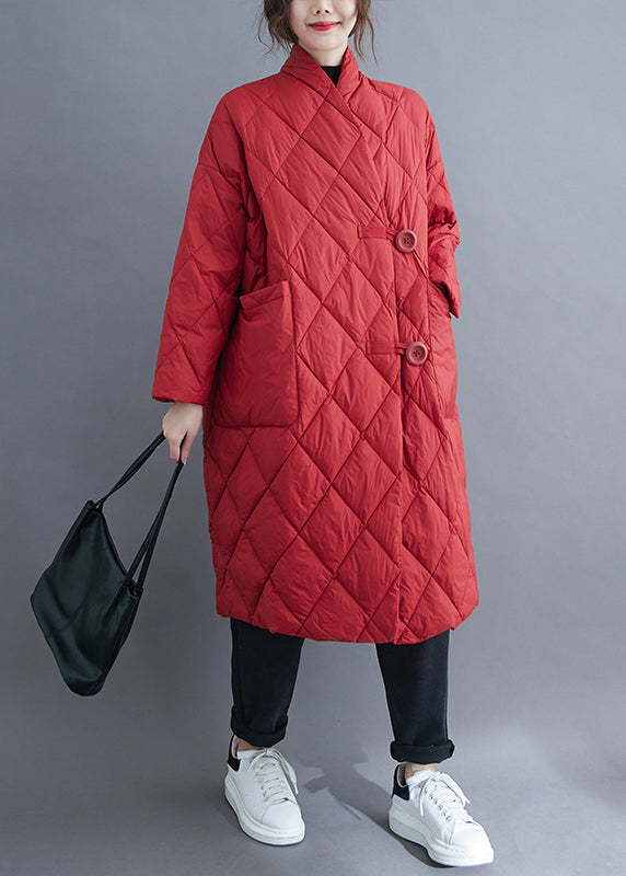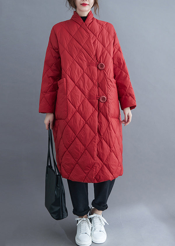 Plus Size Red Button Pockets Cotton Filled Long Parka Winter