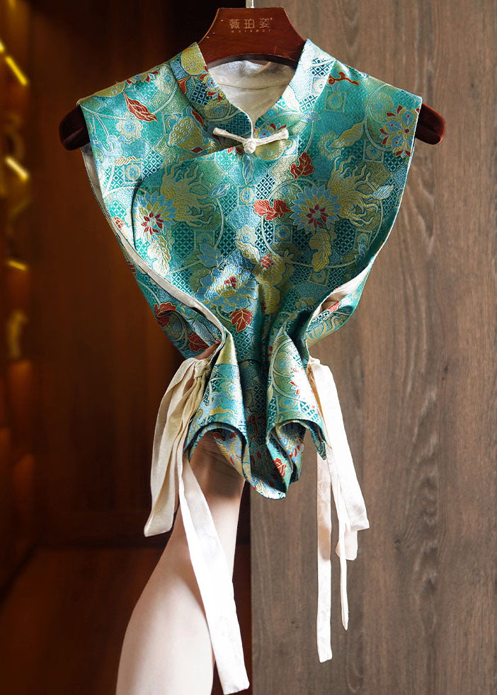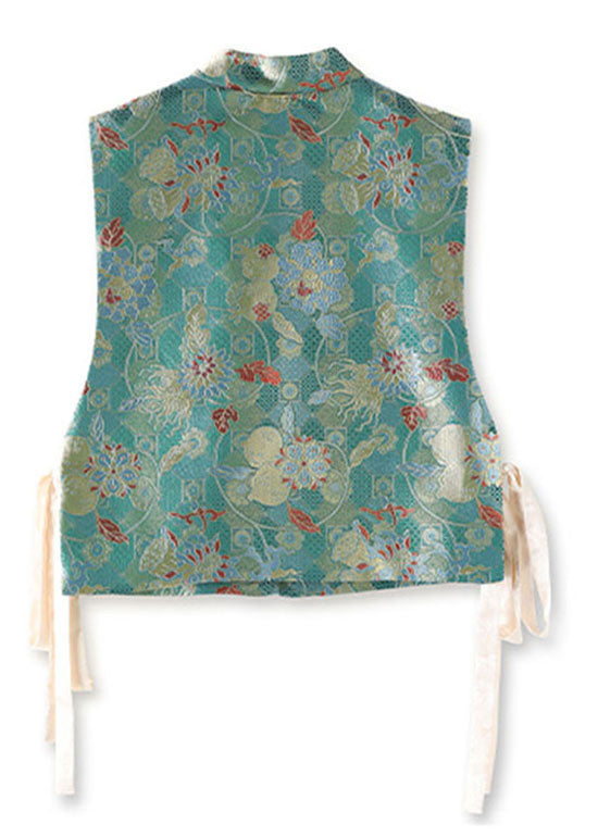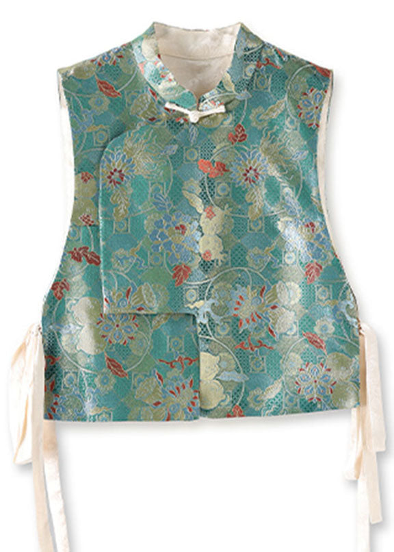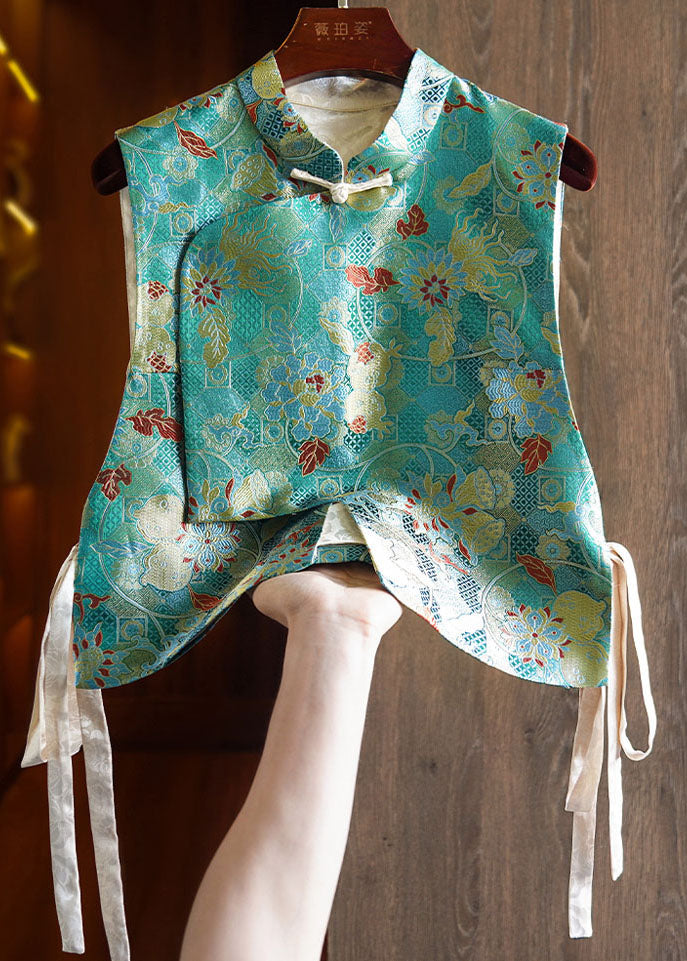 Retro Blue Stand Collar Asymmetrical Side Open Silk Waistcoat Sleeveless