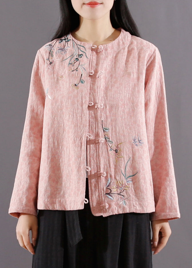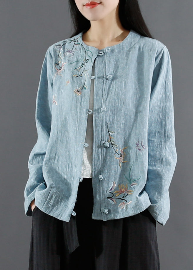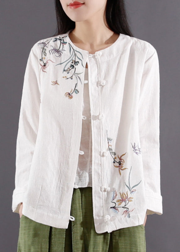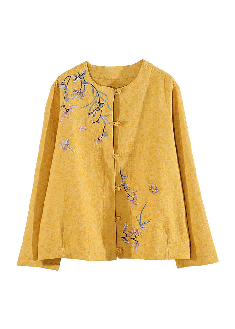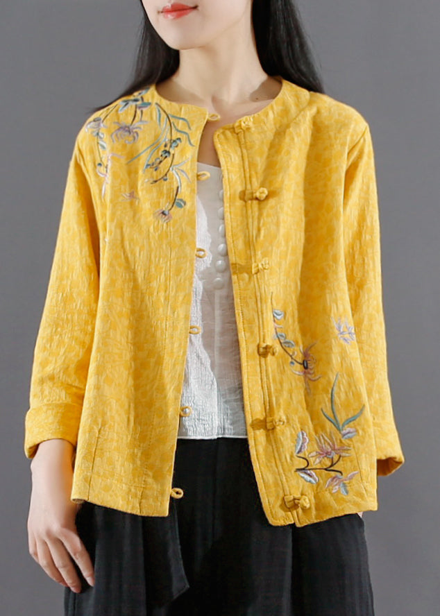 Retro Yellow O Neck Embroideried Cotton Short Coat Spring