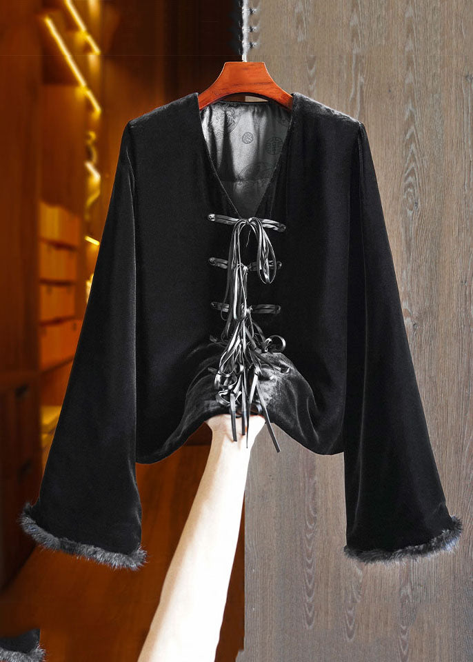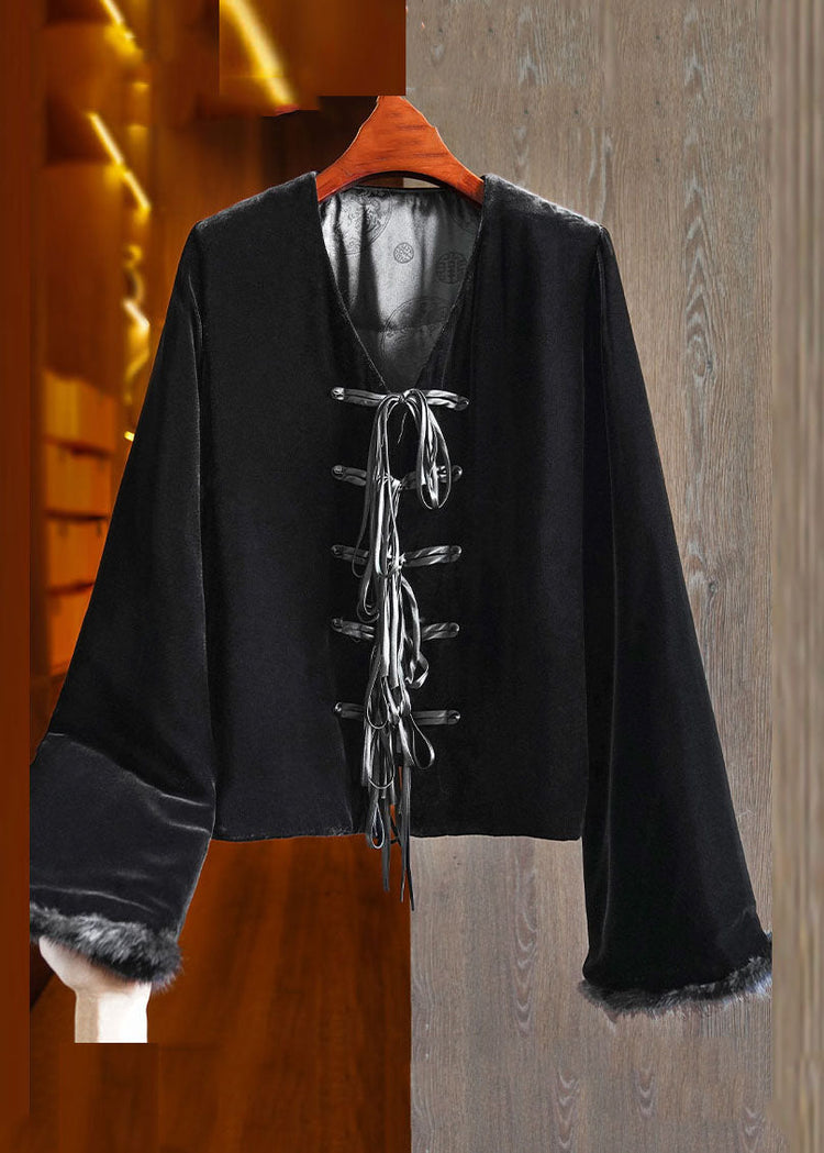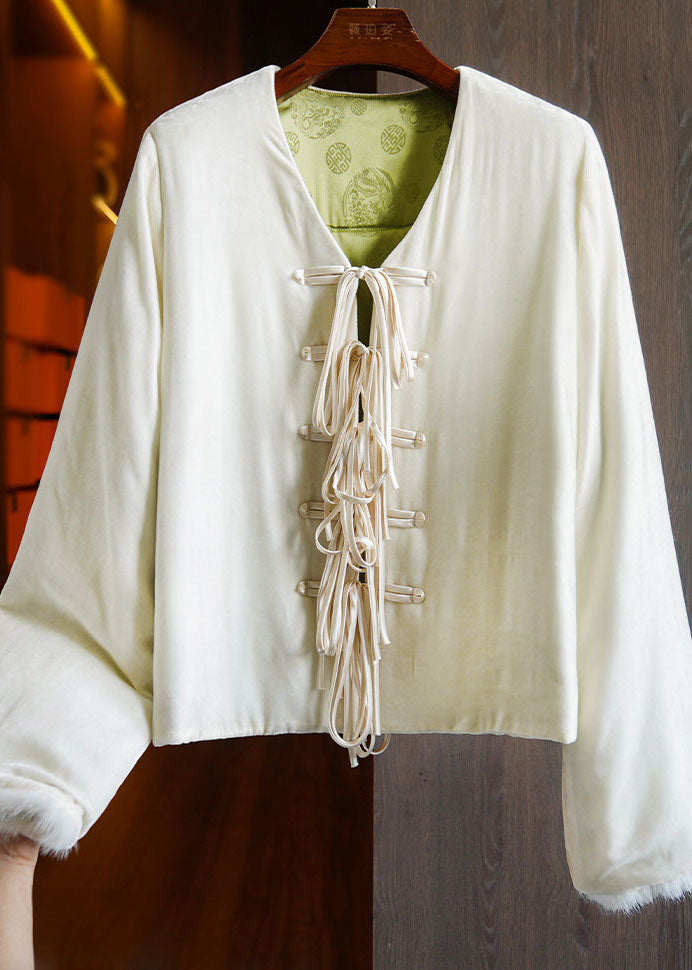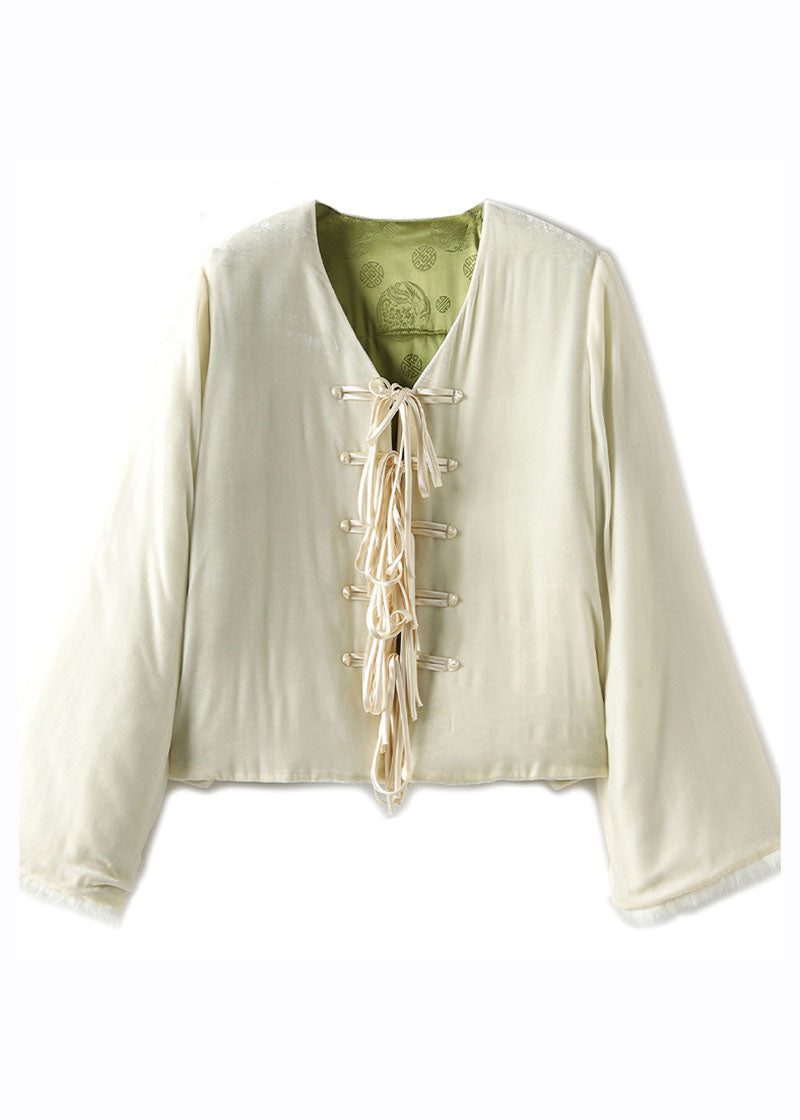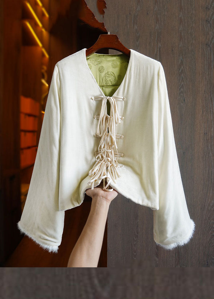 Simple Apricot V Neck Tassel Button Warm Silk Velour Jackets Winter