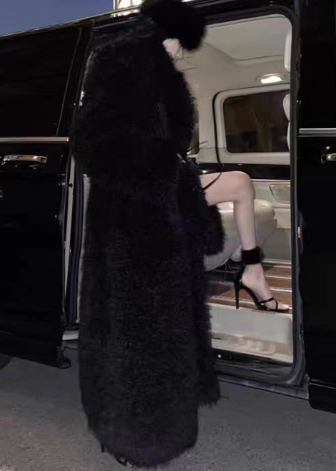Stylish Black Tie Waist Patchwork Fuzzy Fur Fluffy Coat Winter