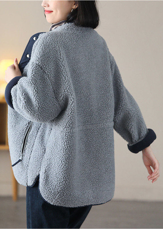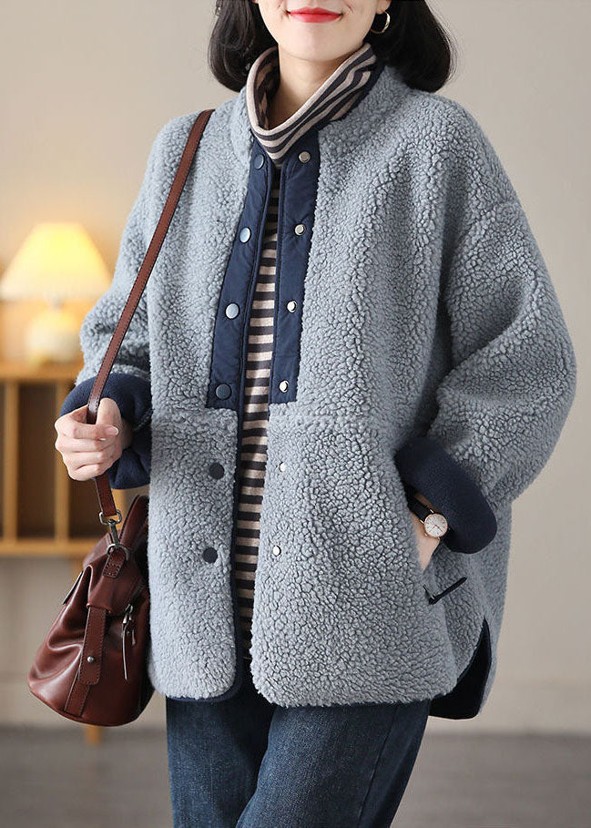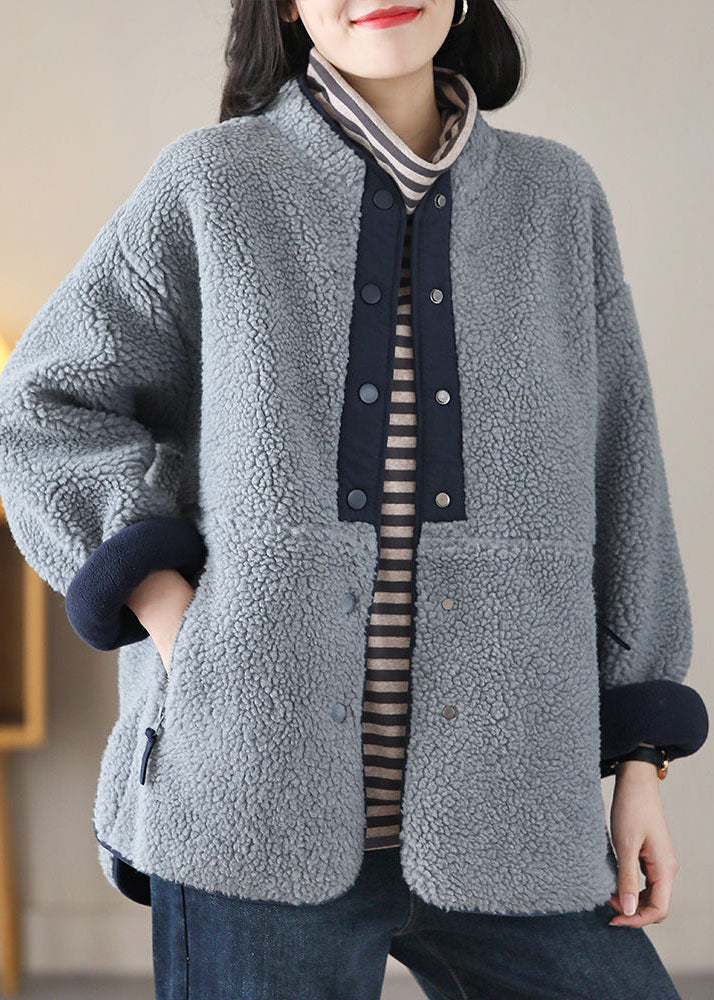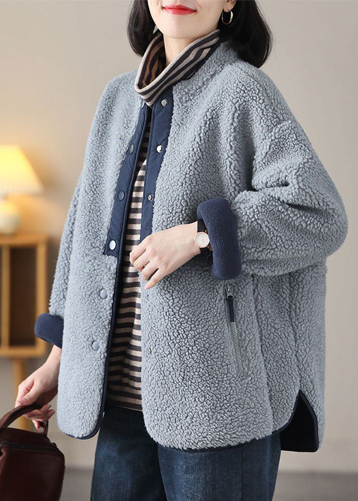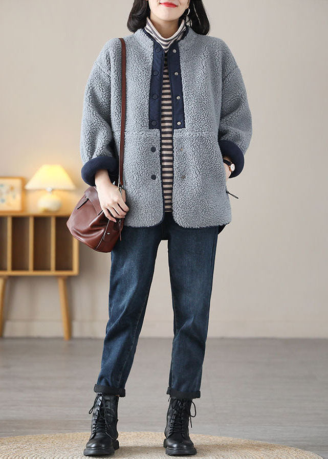 Stylish Grey Blue Stand Collar Patchwork Teddy Faux Fur Jackets Spring