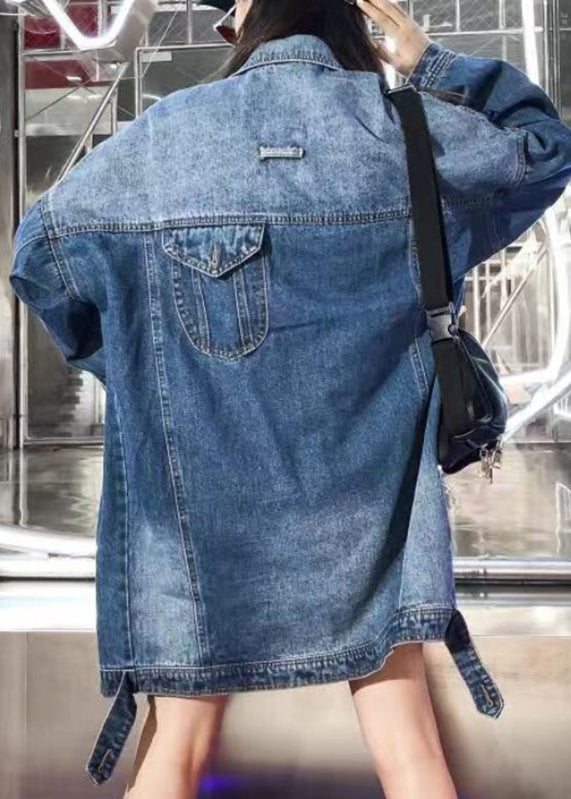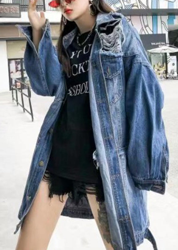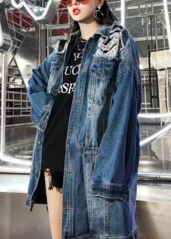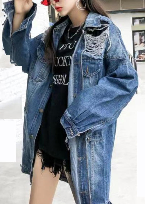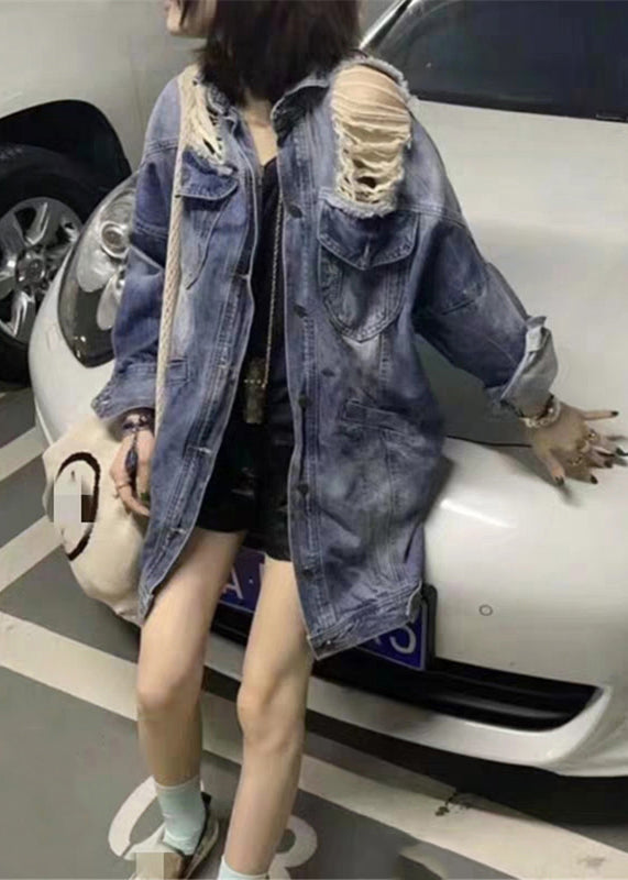 Women Denim Blue Peter Pan Collar Patchwork Hole Cotton Coat Long Sleeve