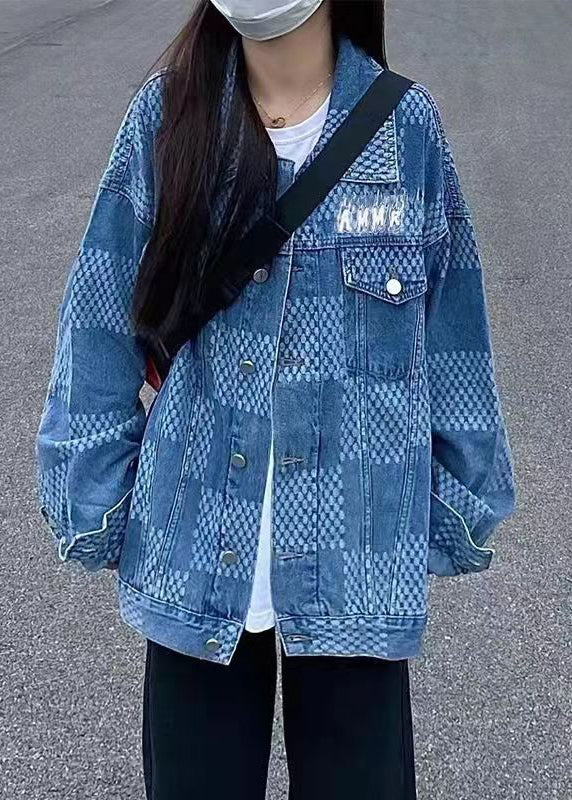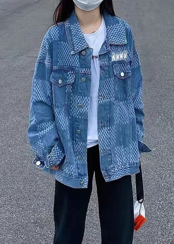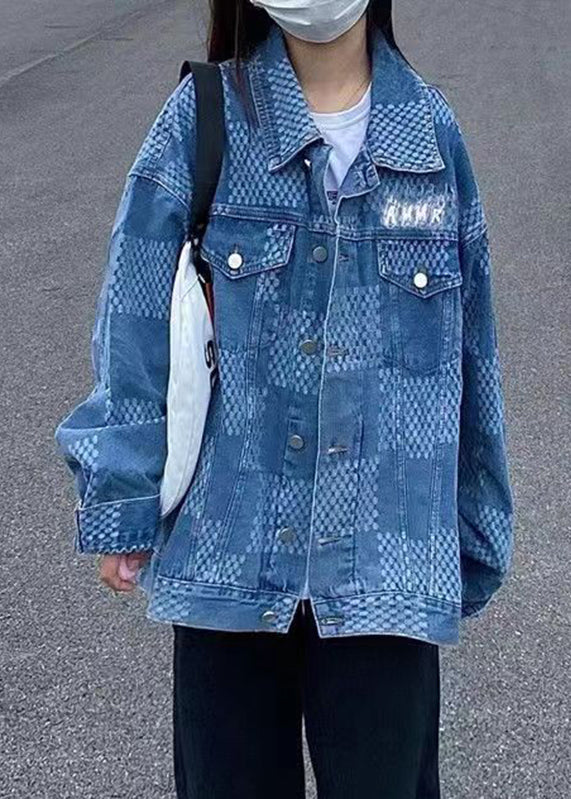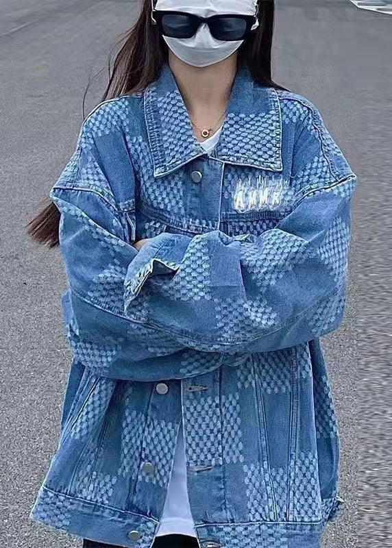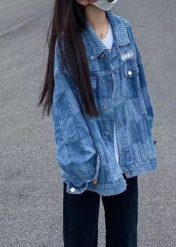 Women Denim Blue Peter Pan Collar Pockets Plaid Print Coat Long Sleeve