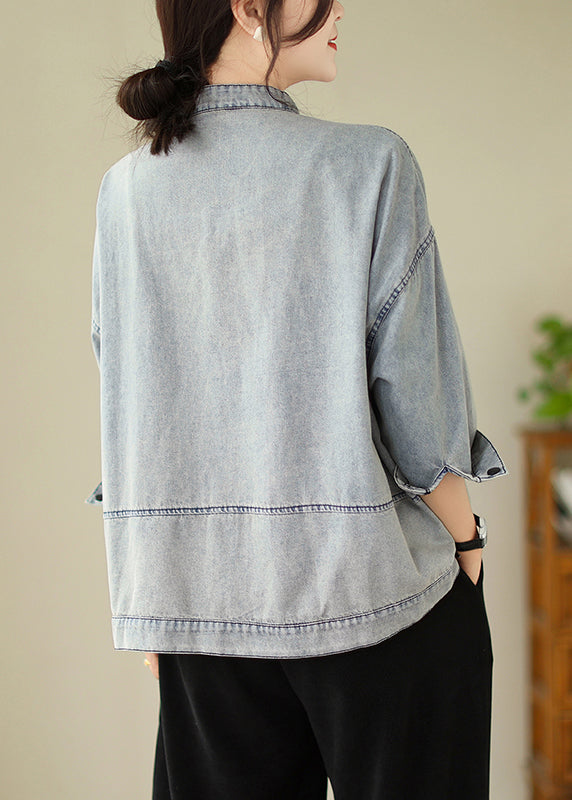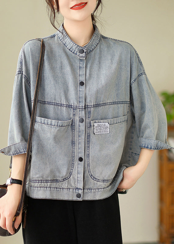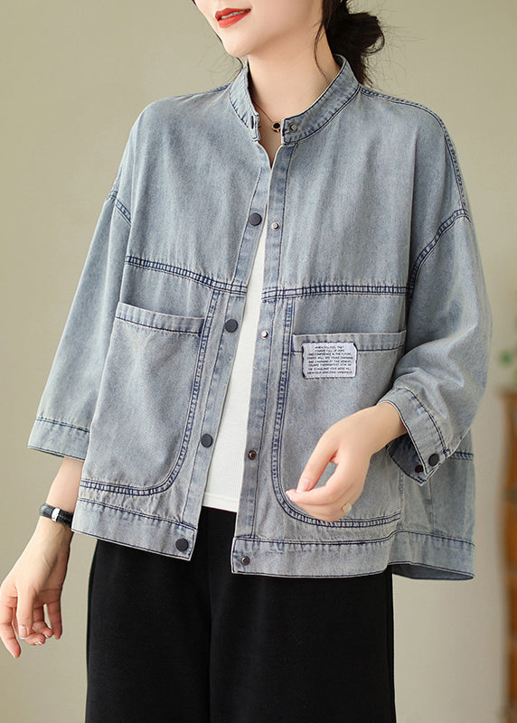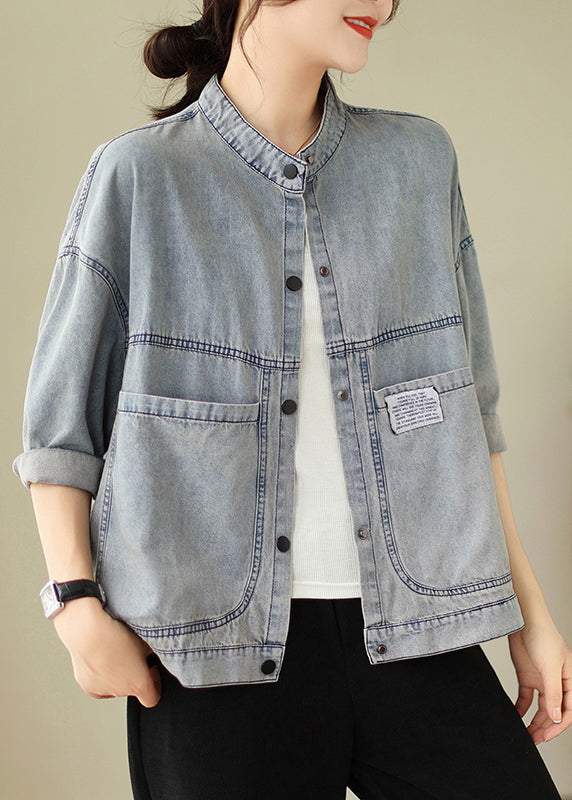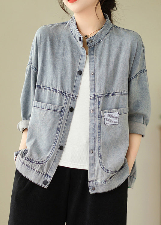 Women Light Blue Stand Collar Pockets Denim Jackets Spring