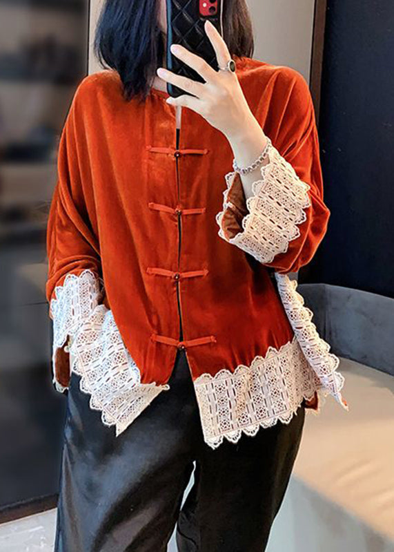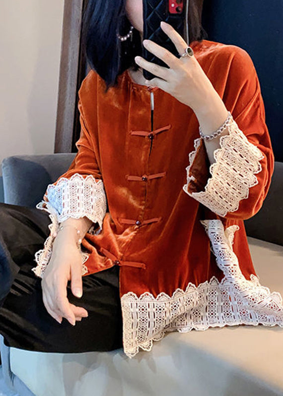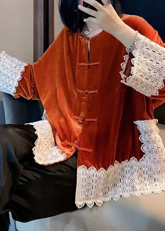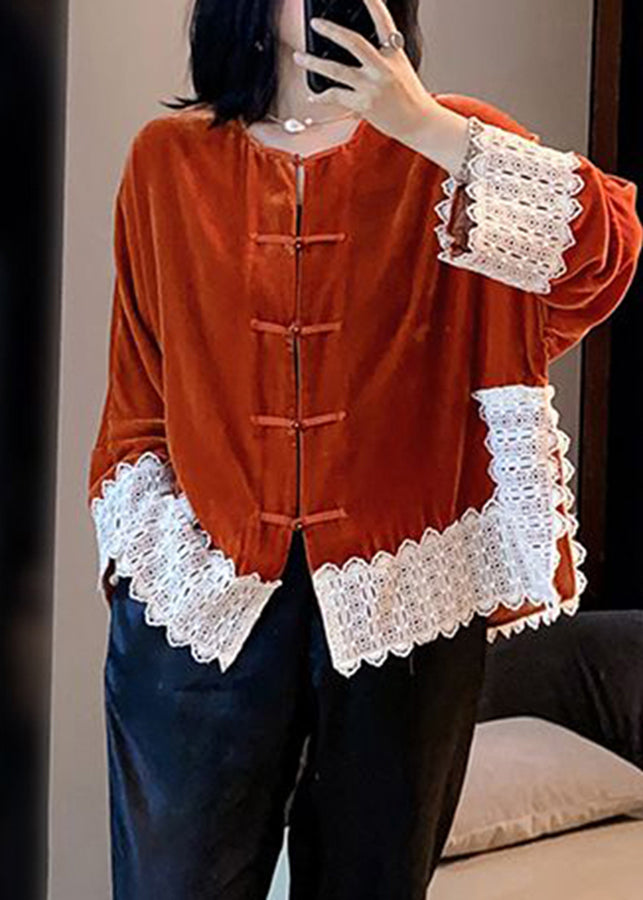 Women Orange Lace Patchwork Silk Velour Coats Long Sleeve