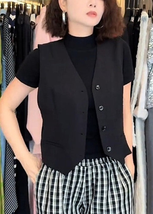 Black Ruffled Tulle Patchwork Cotton Waistcoat V Neck Summer