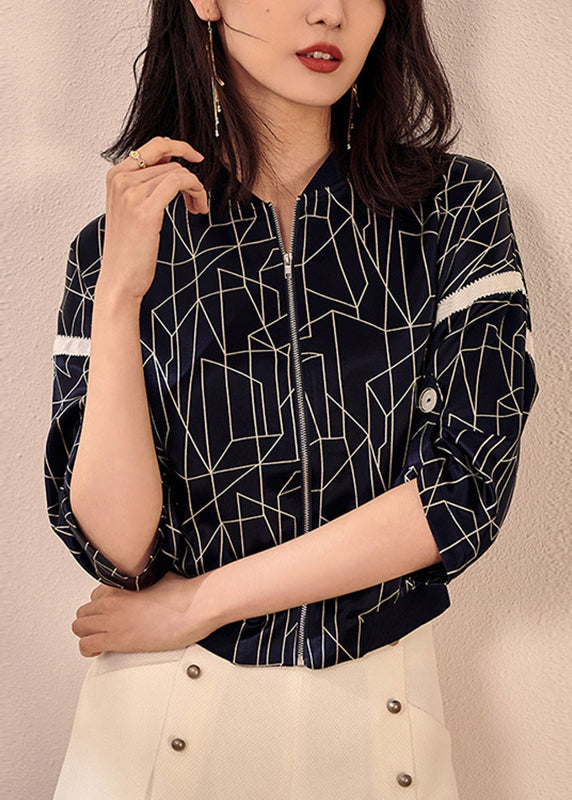 Vogue Navy O-Neck Plaid Zippered Coat Fall