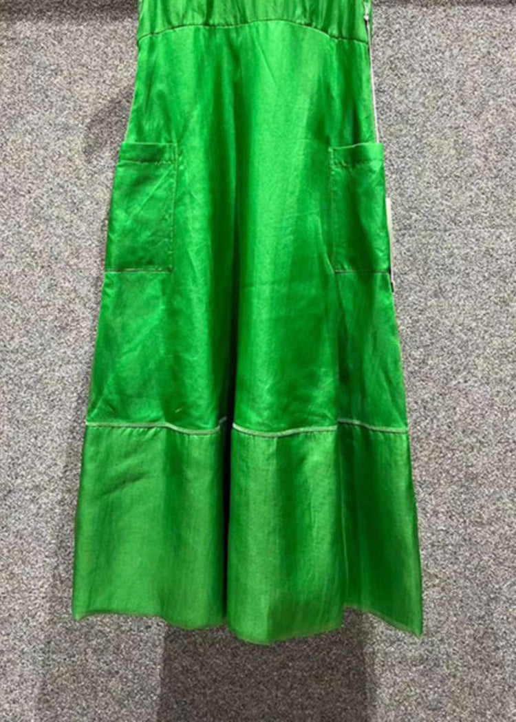 Art Green O Neck Pockets Patchwork Silk Dresses Sleeveless