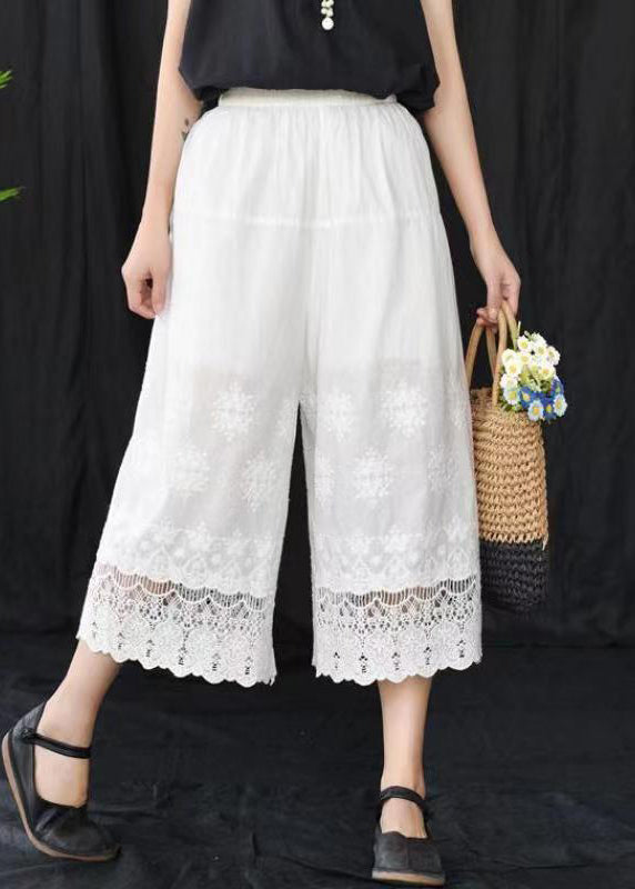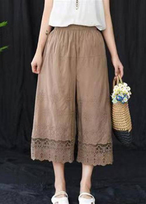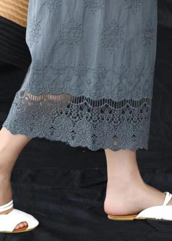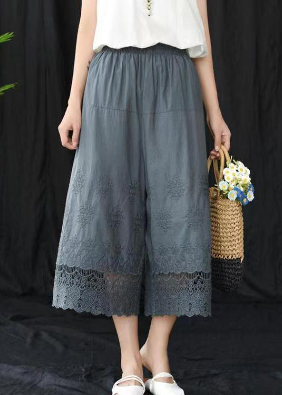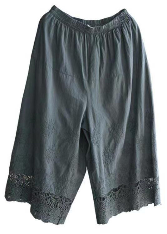 Women Grey Embroidered Elastic Waist Cotton Crop Pants Summer