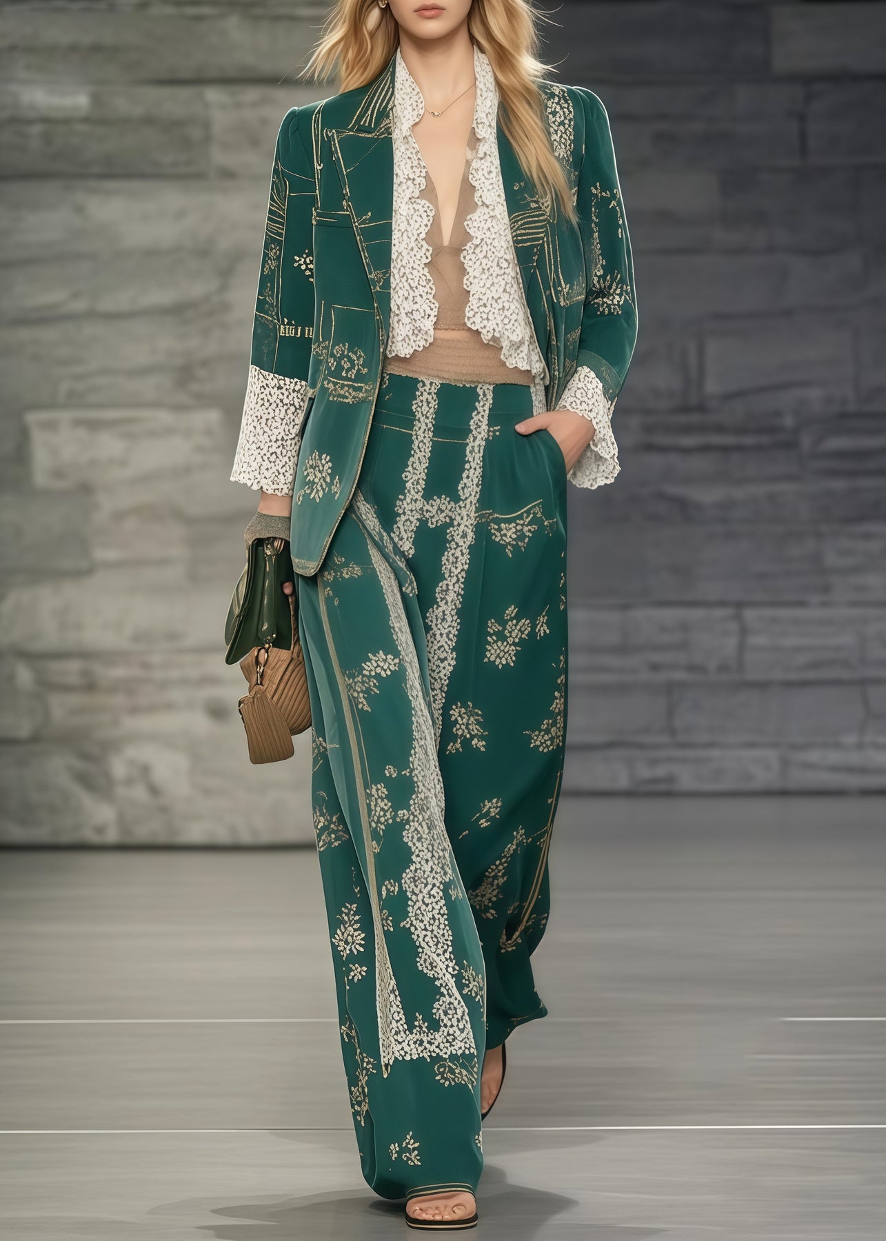 Casual Tea Green Print Patchwork Lace Two Pieces Set Oversized Spring