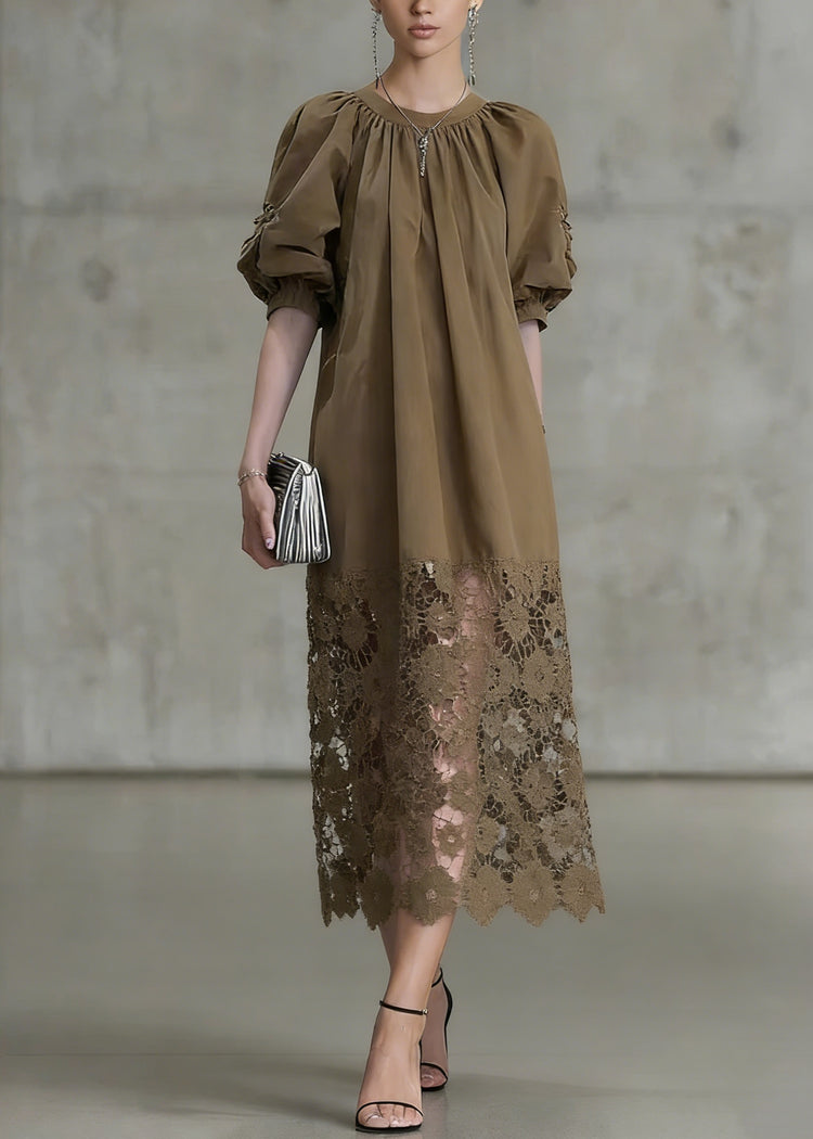 Fashion Light Coffee Puff Sleeve Lace Patchwork Cotton Long Dress