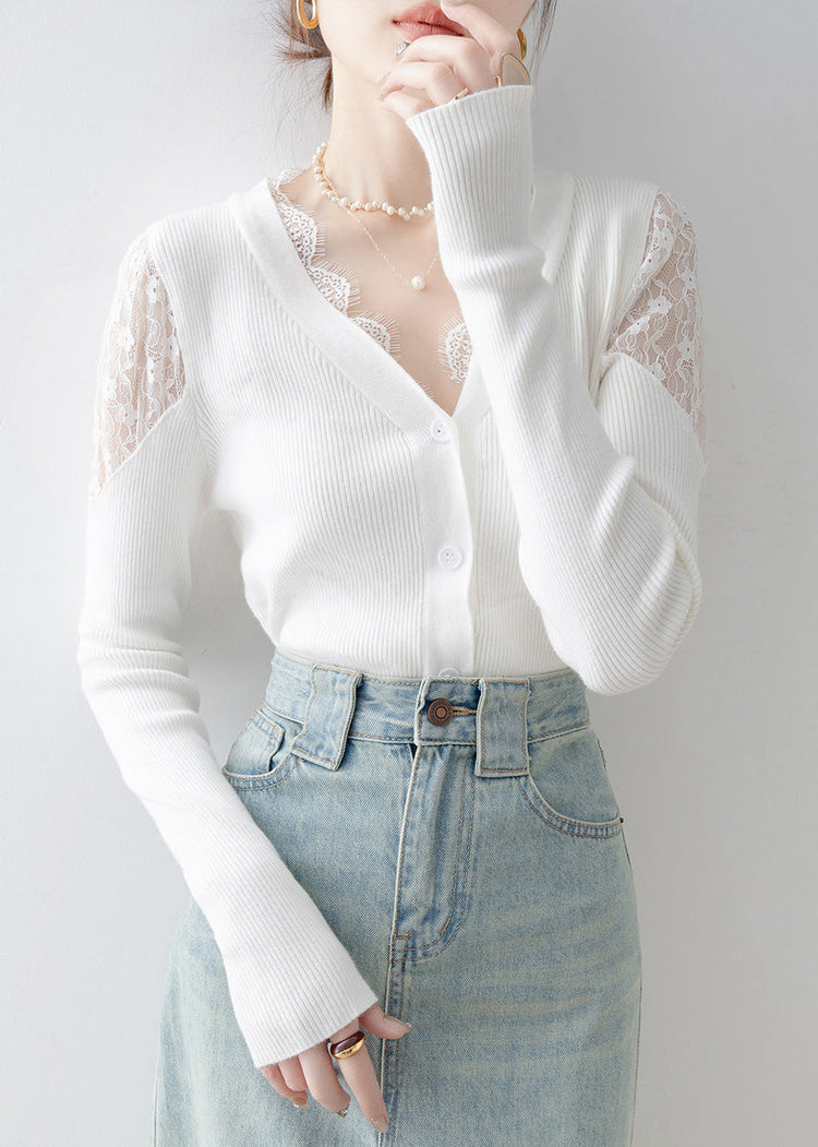 French White V Neck Lace Patchwork Knit Sweater Spring