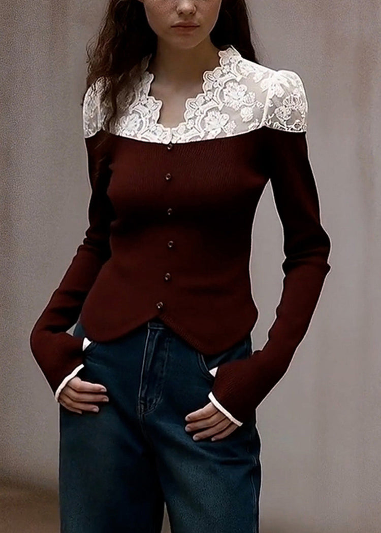 Style Brown V Neck Patchwork Lace Knit Shirts Winter