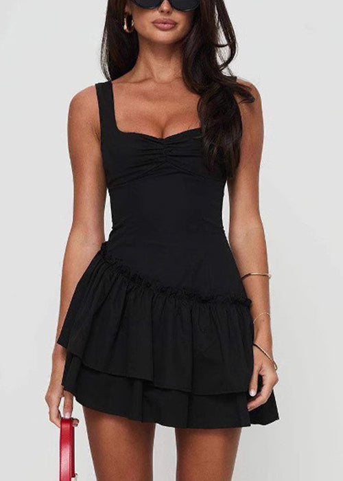 Black Lace Up Cotton Spaghetti Strap Dress Ruffled Sleeveless