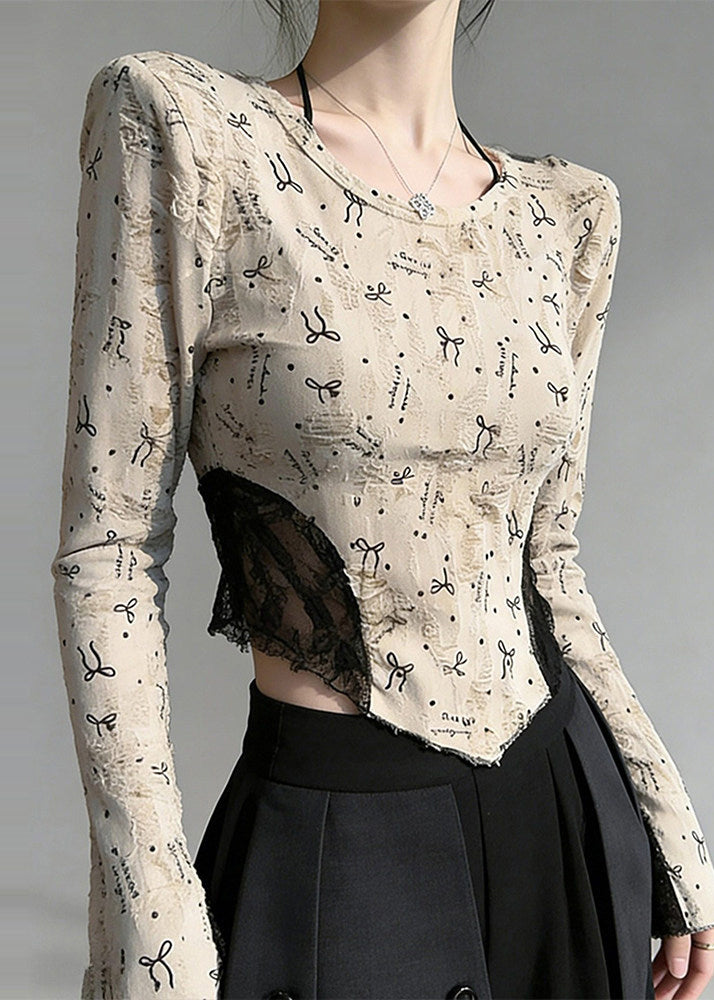 Boho Beige Print Lace Patchwork Cotton Blouses Flare Sleeve