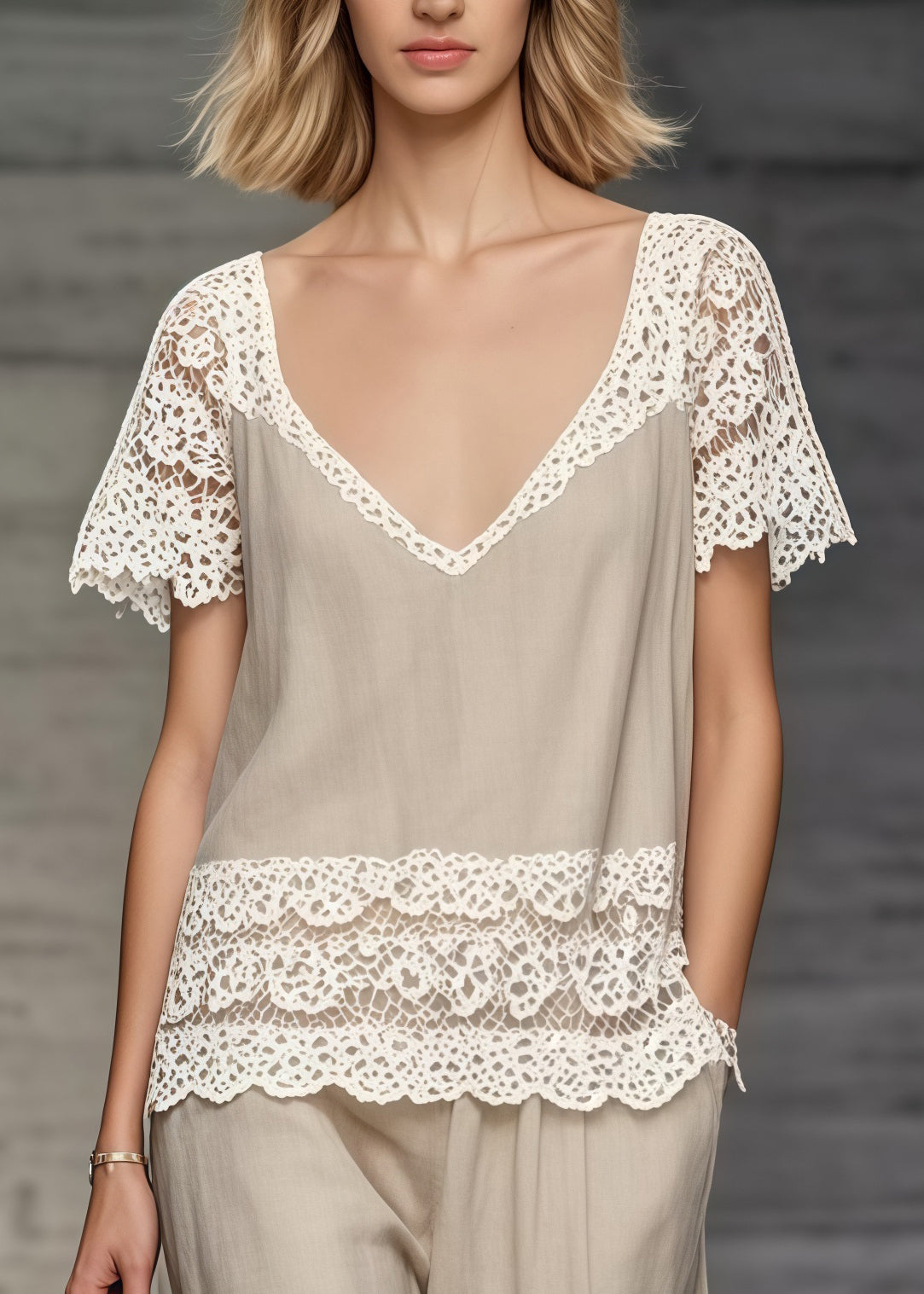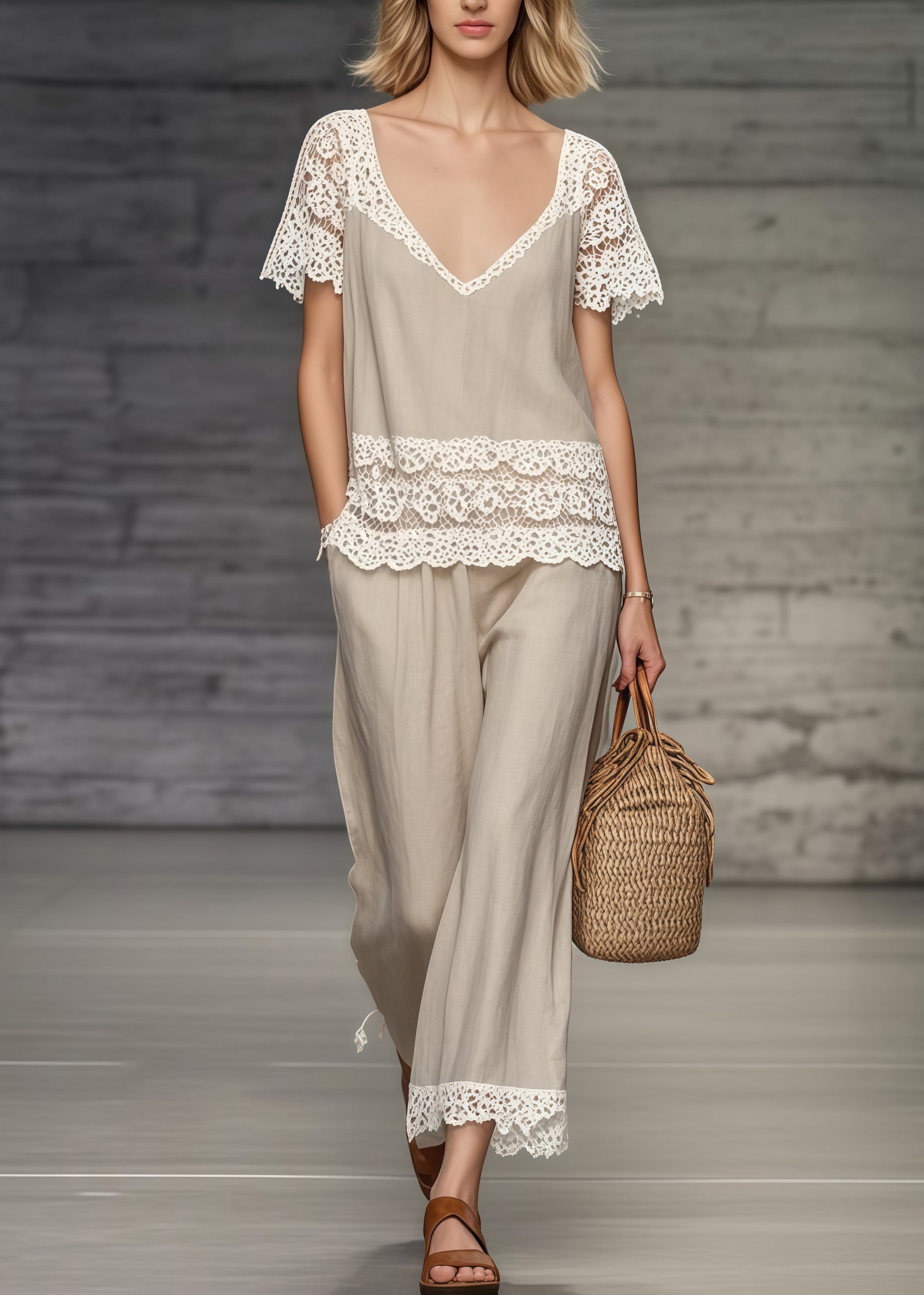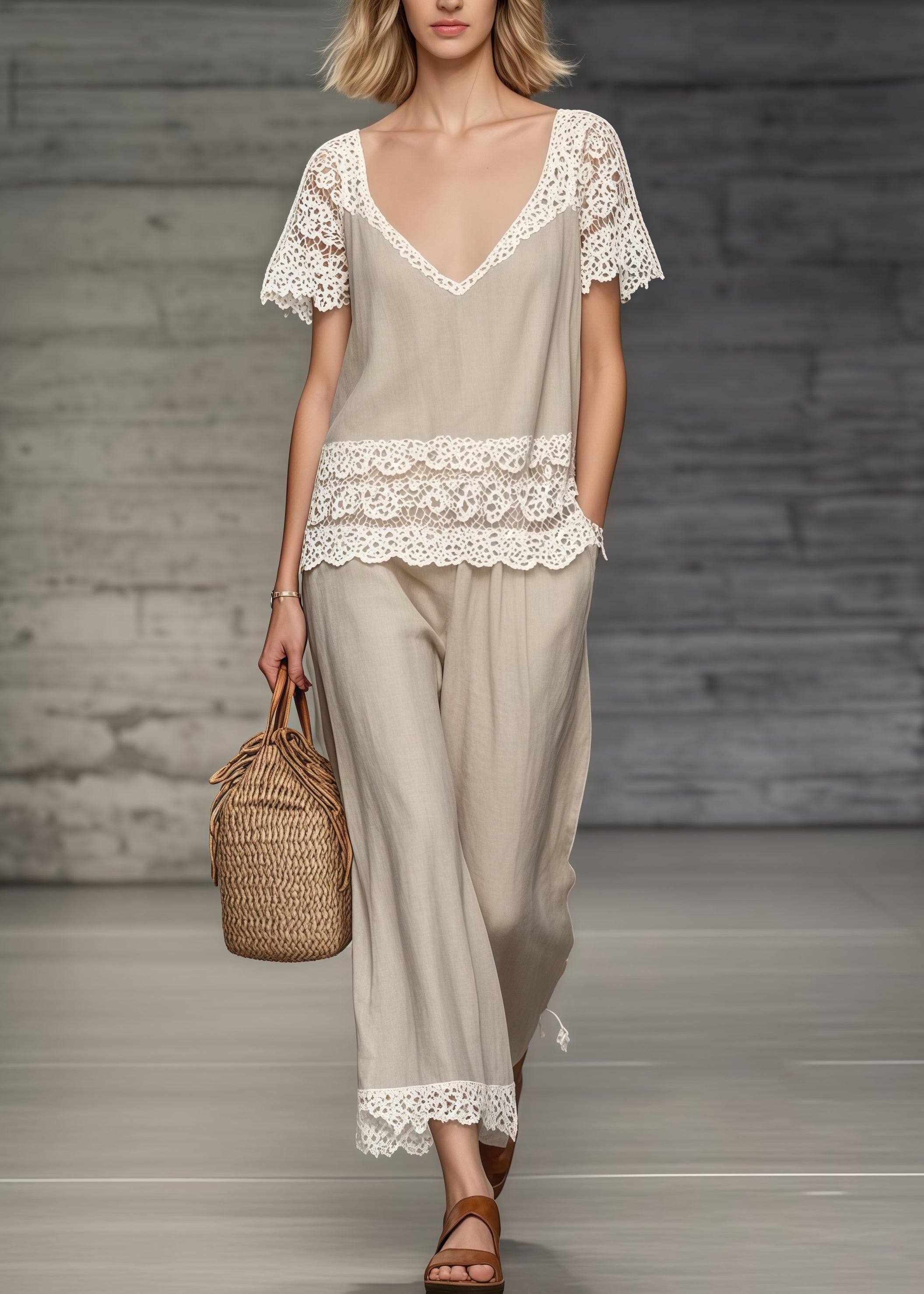 Boho Khaki V Neck Lace Patchwork Two Piece Set Women Clothing Summer