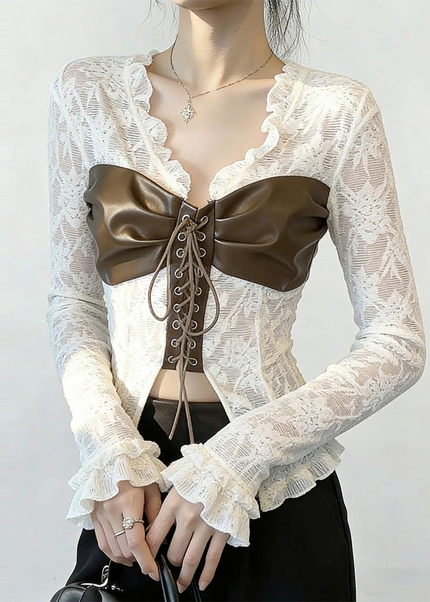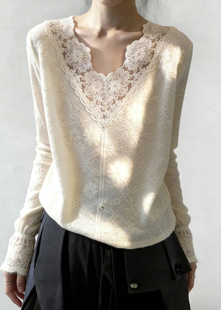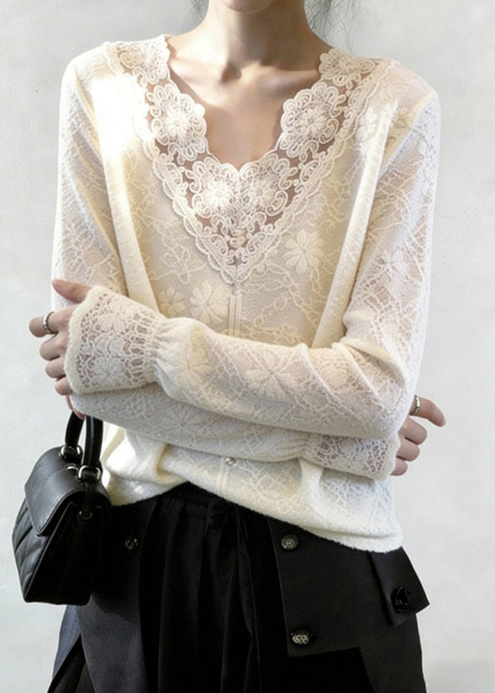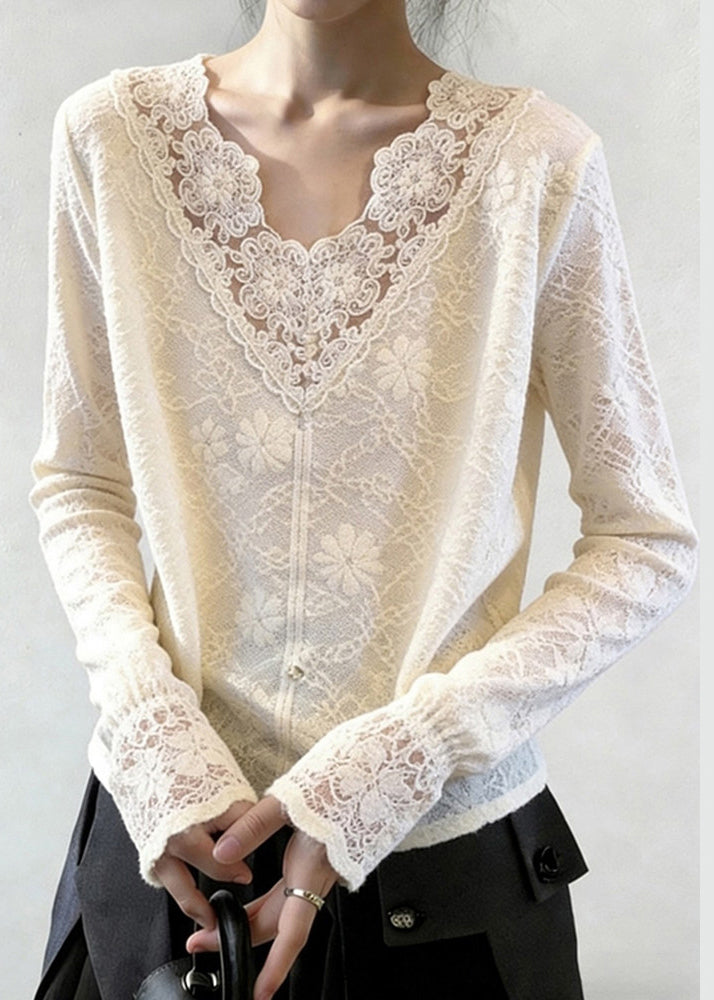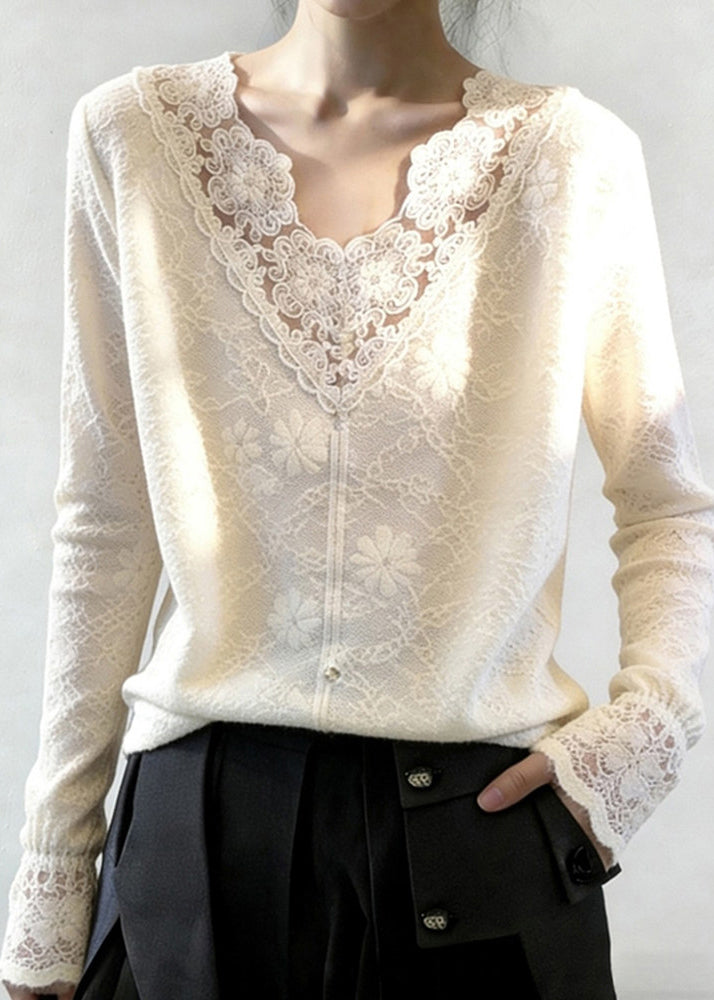 Women White V Neck Patchwork Jacquard Lace Shirt Tops Spring