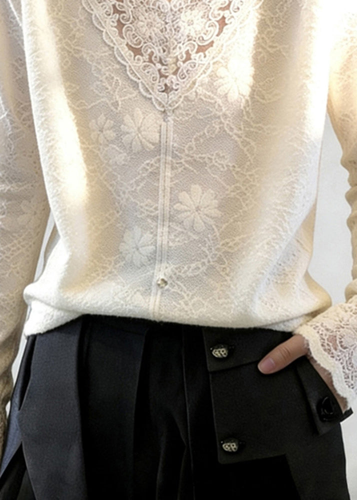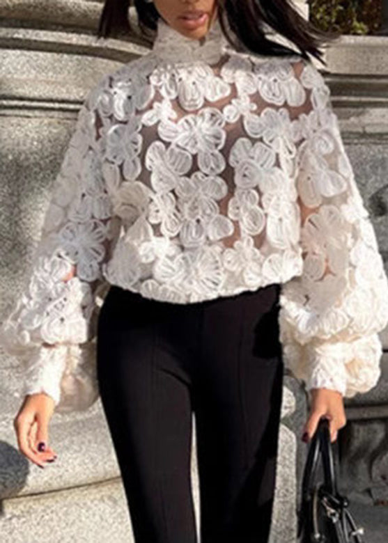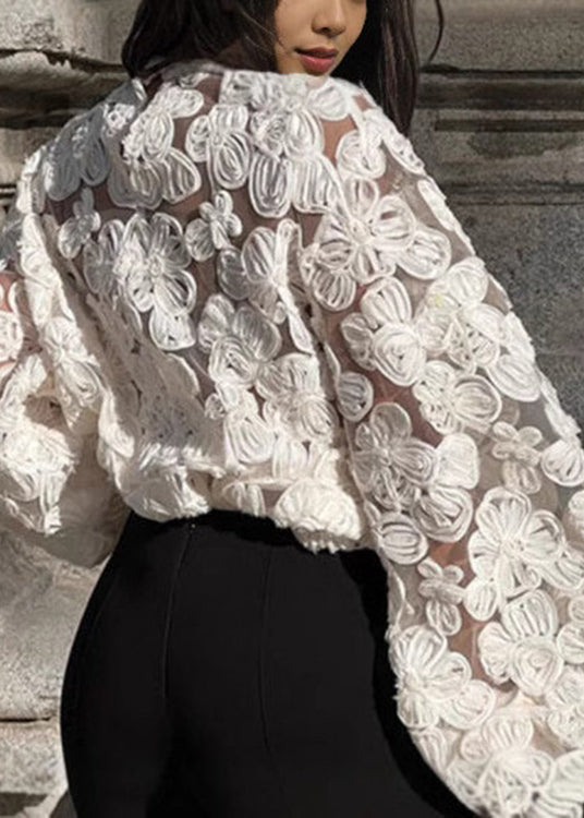 Chic White Notched Floral Lace Top Lantern Sleeve