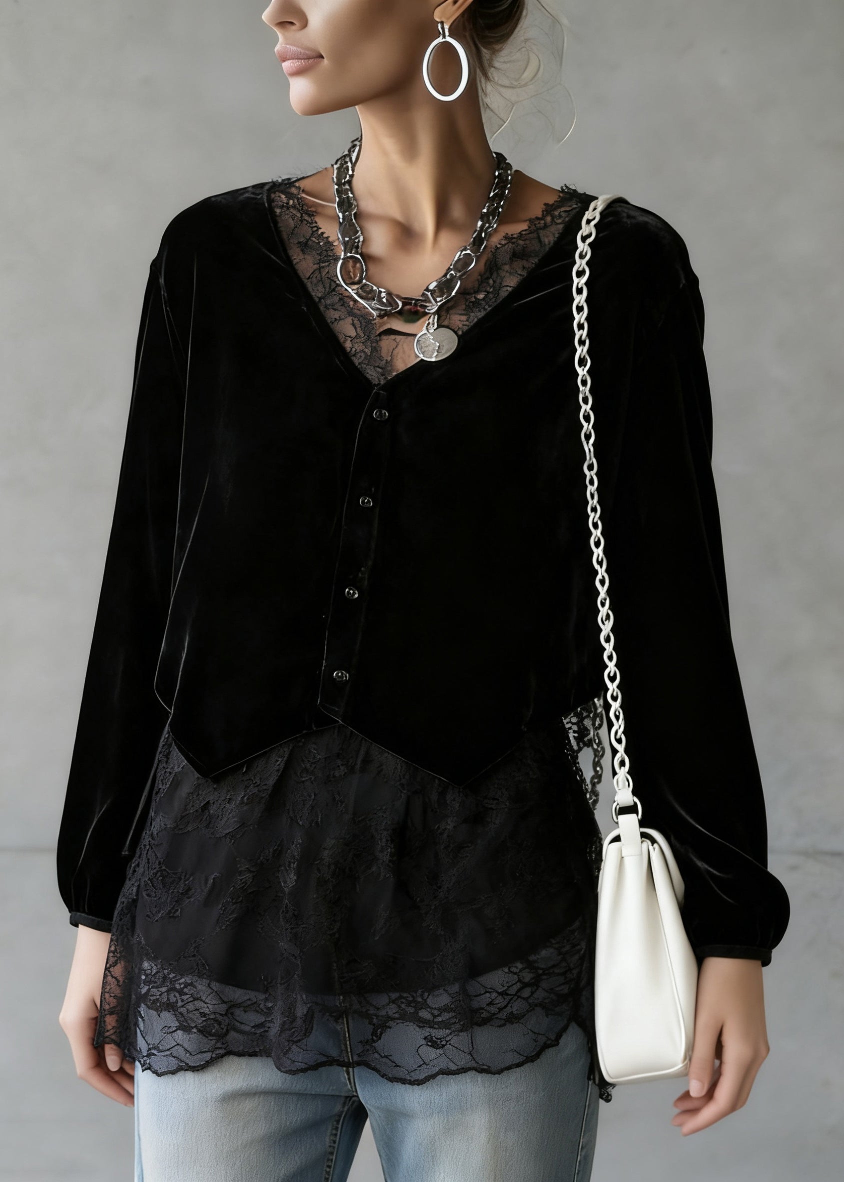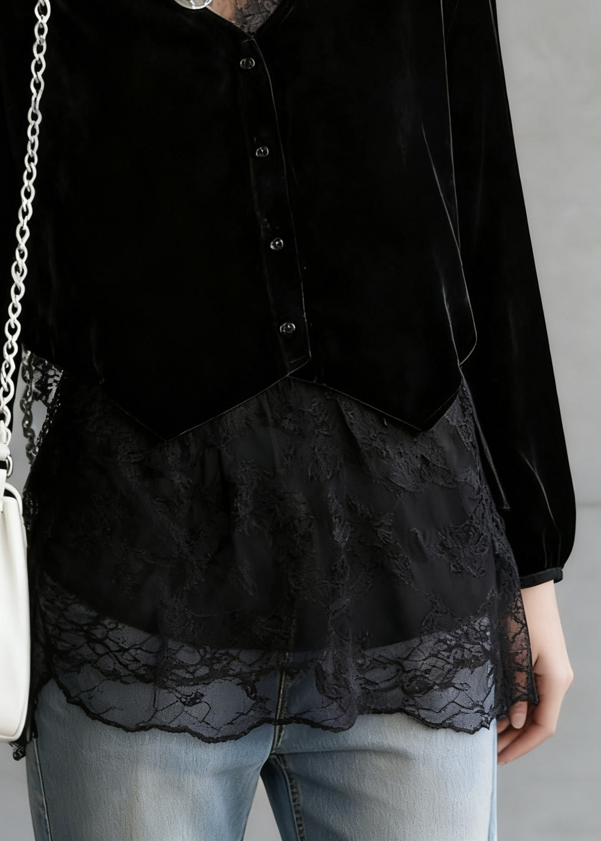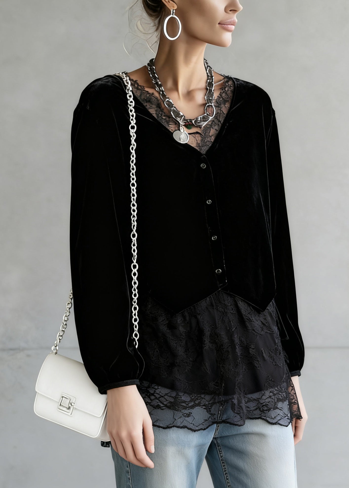 Elegant Black V Neck Lace Patchwork Velour Shirt Spring