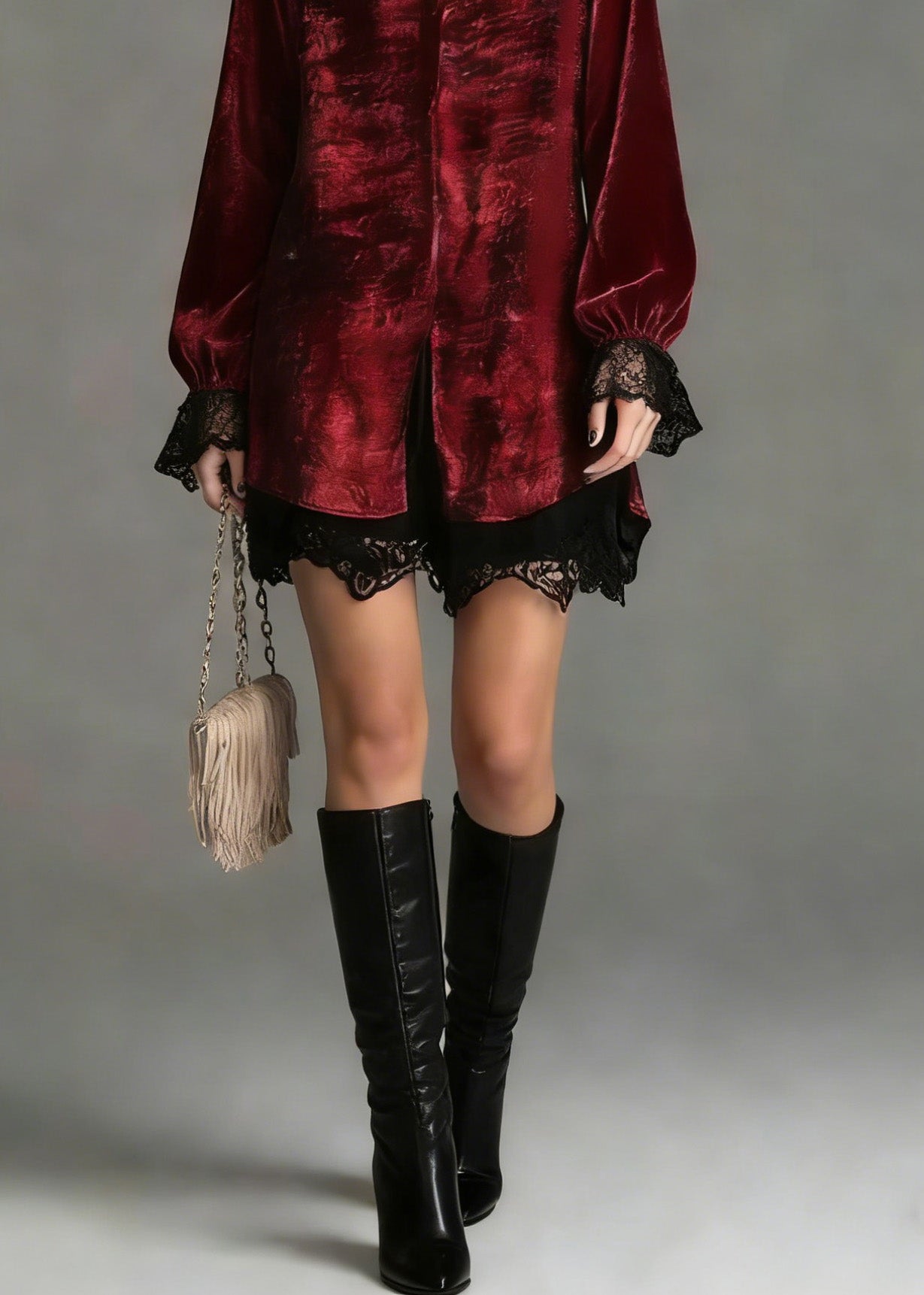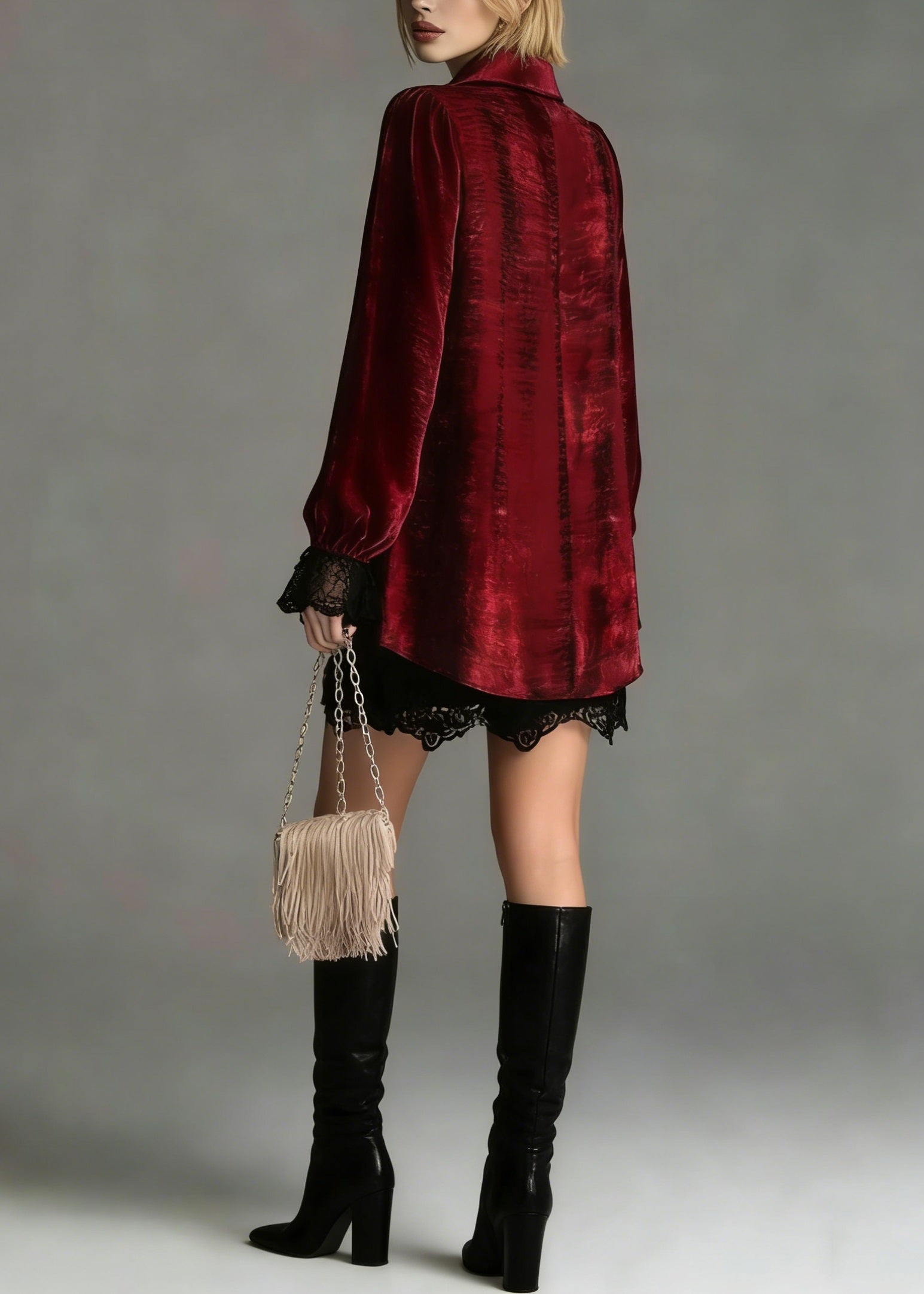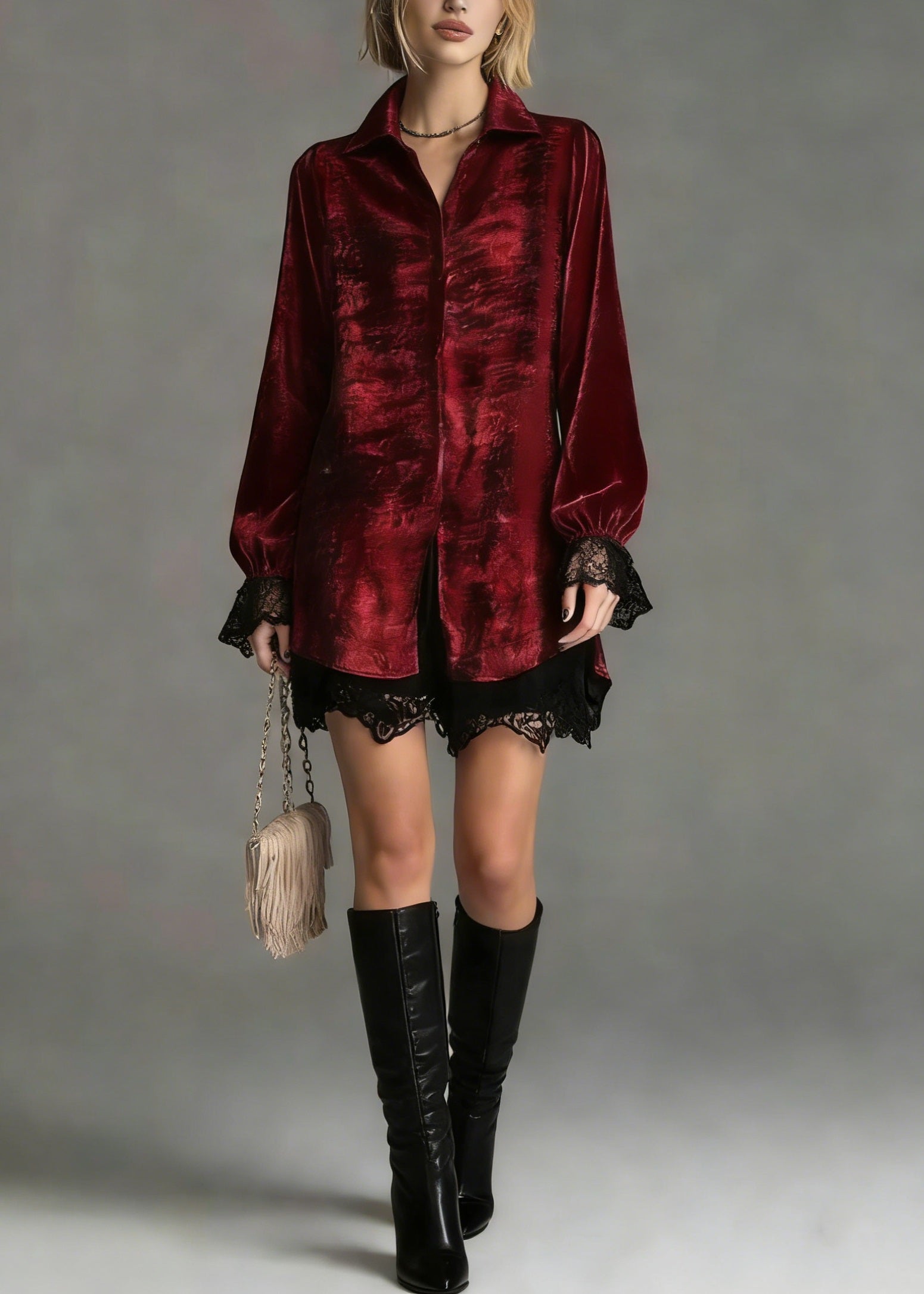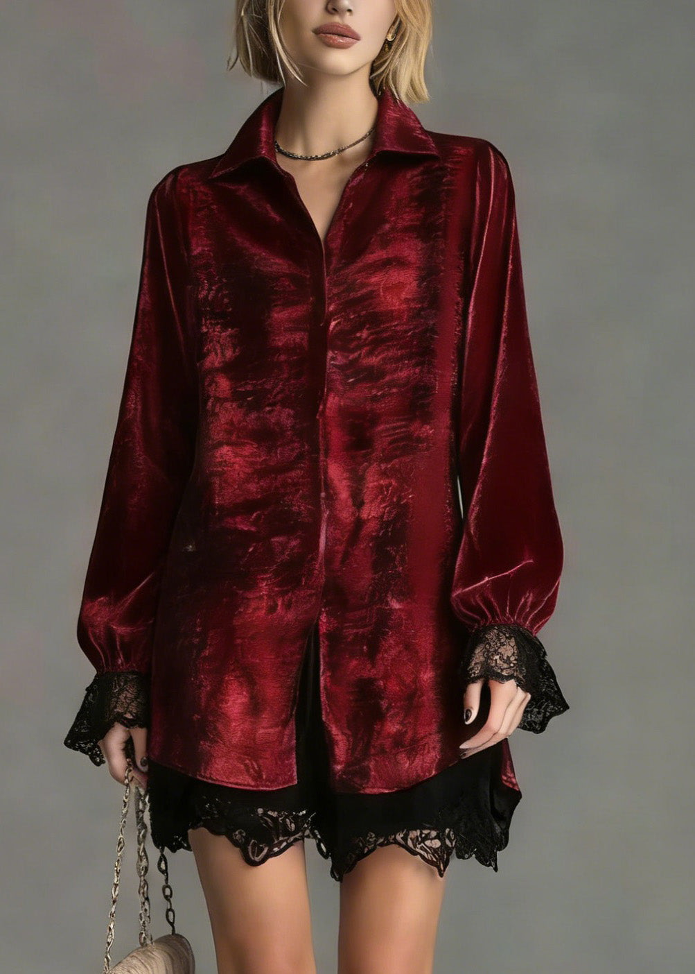 Fashion Red Peter Pan Collar Lace Patchwork Silk Shirt Top Spring
