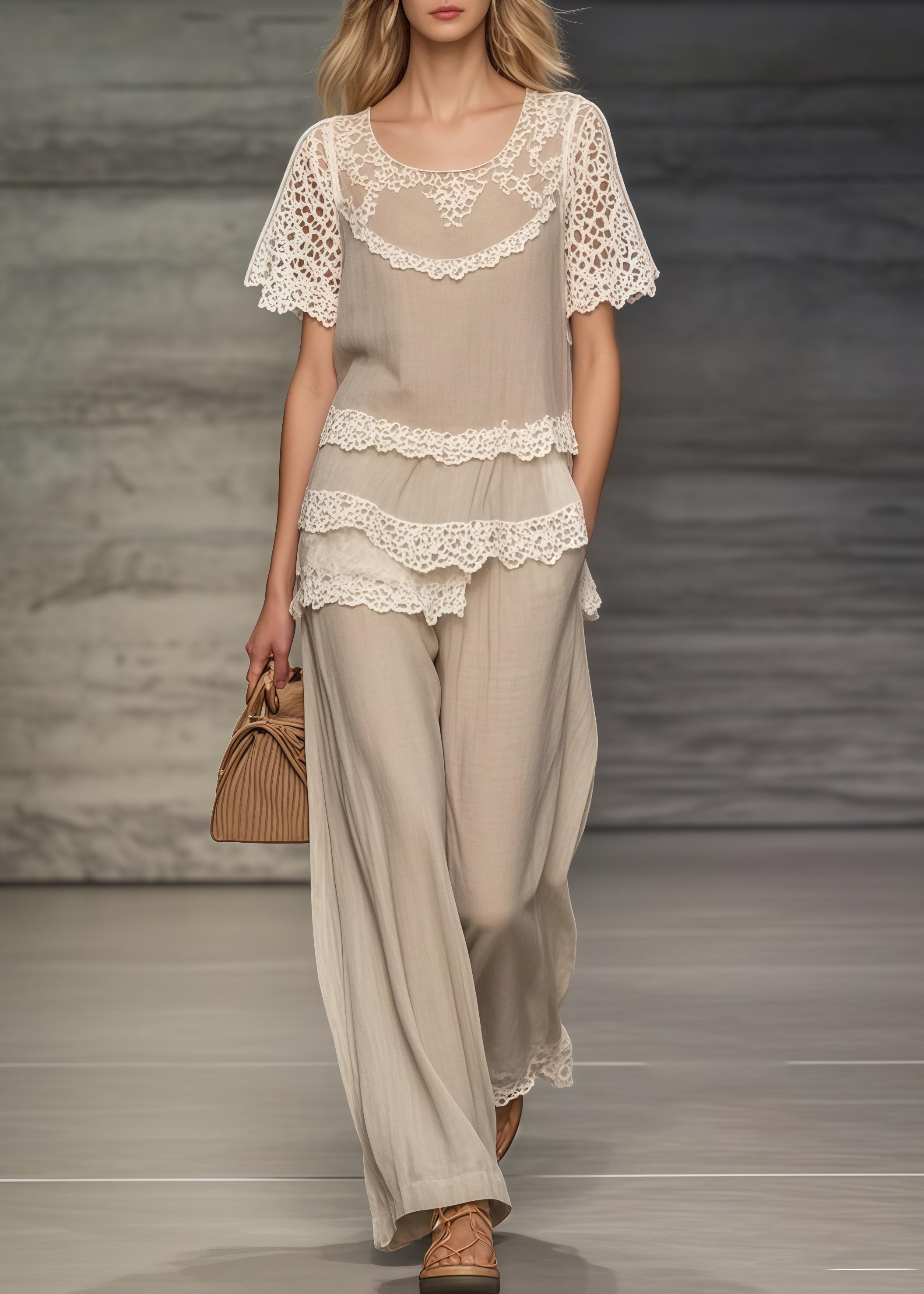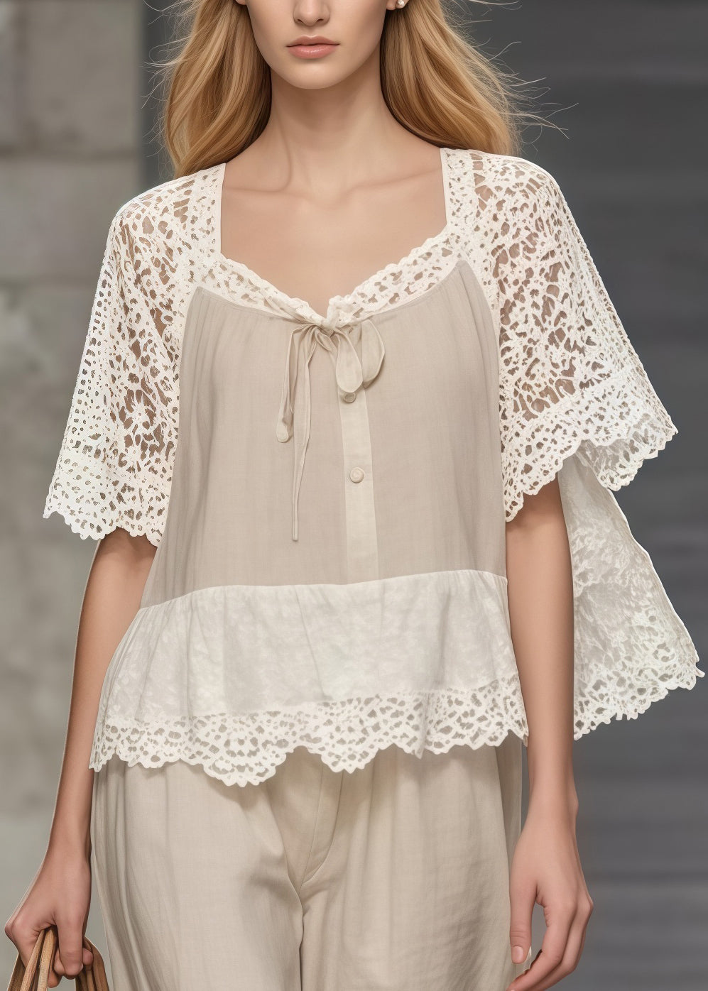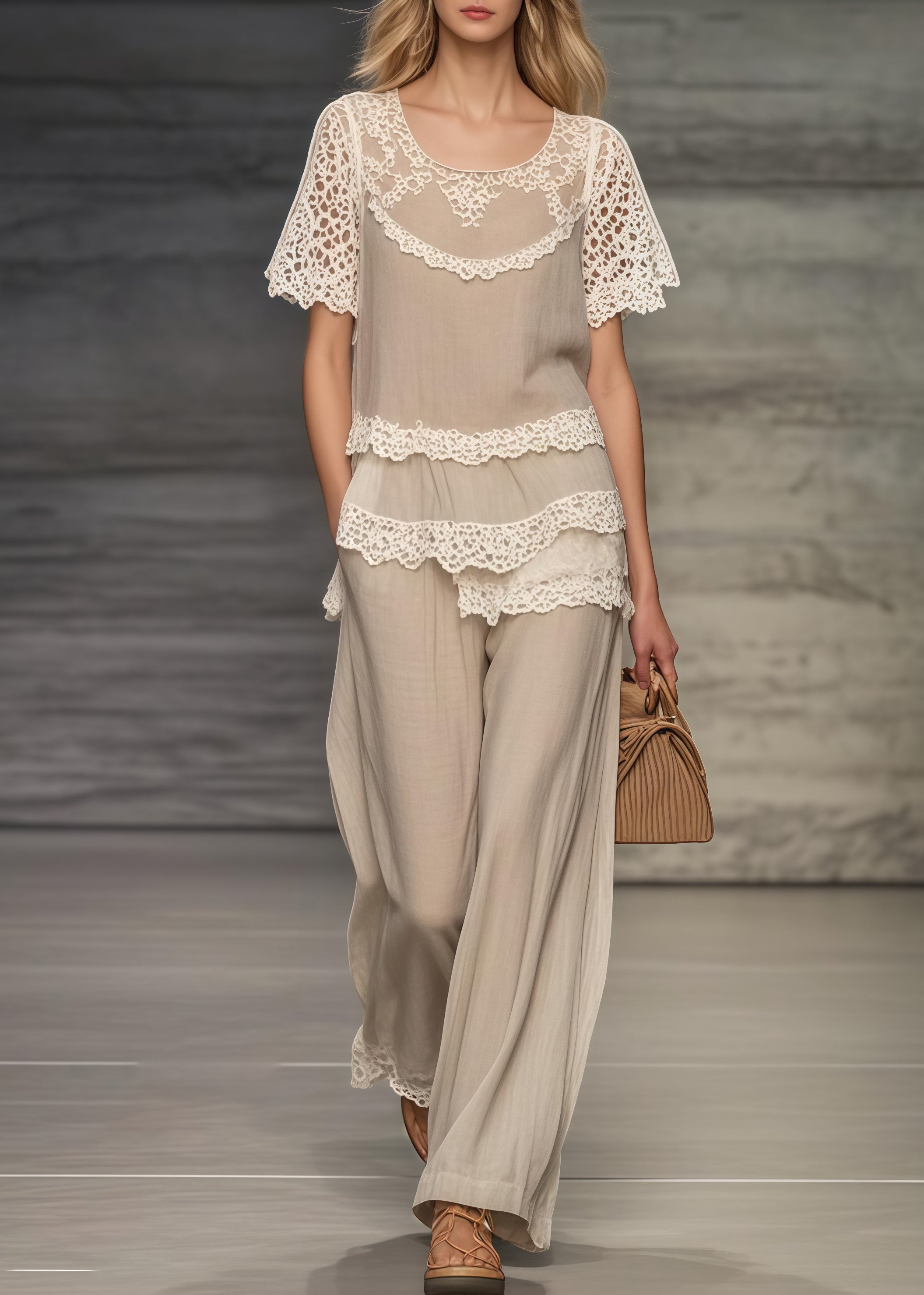 Fine Khaki Square Collar Lace Patchwork Hollow Out Two Pieces Set Summer