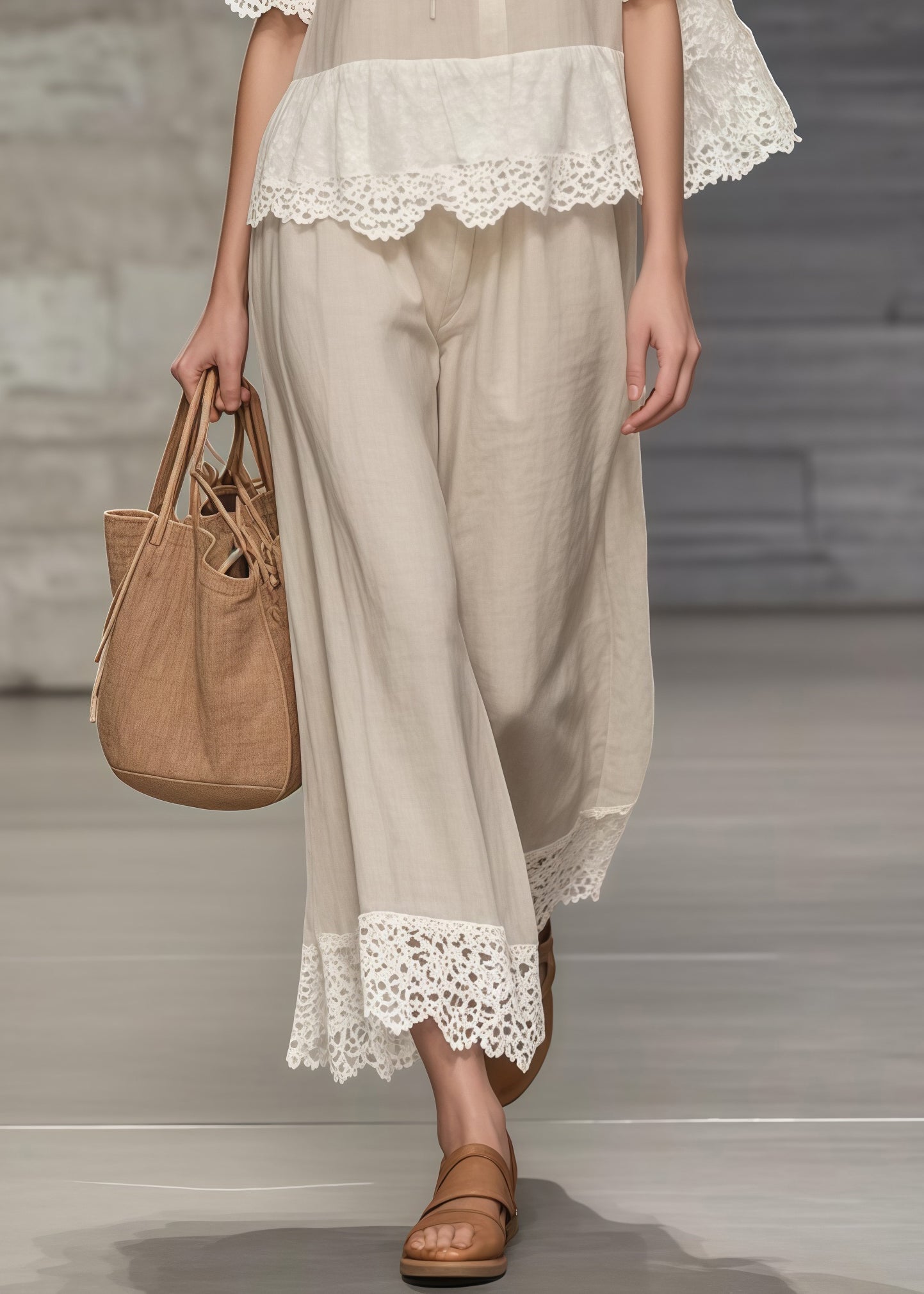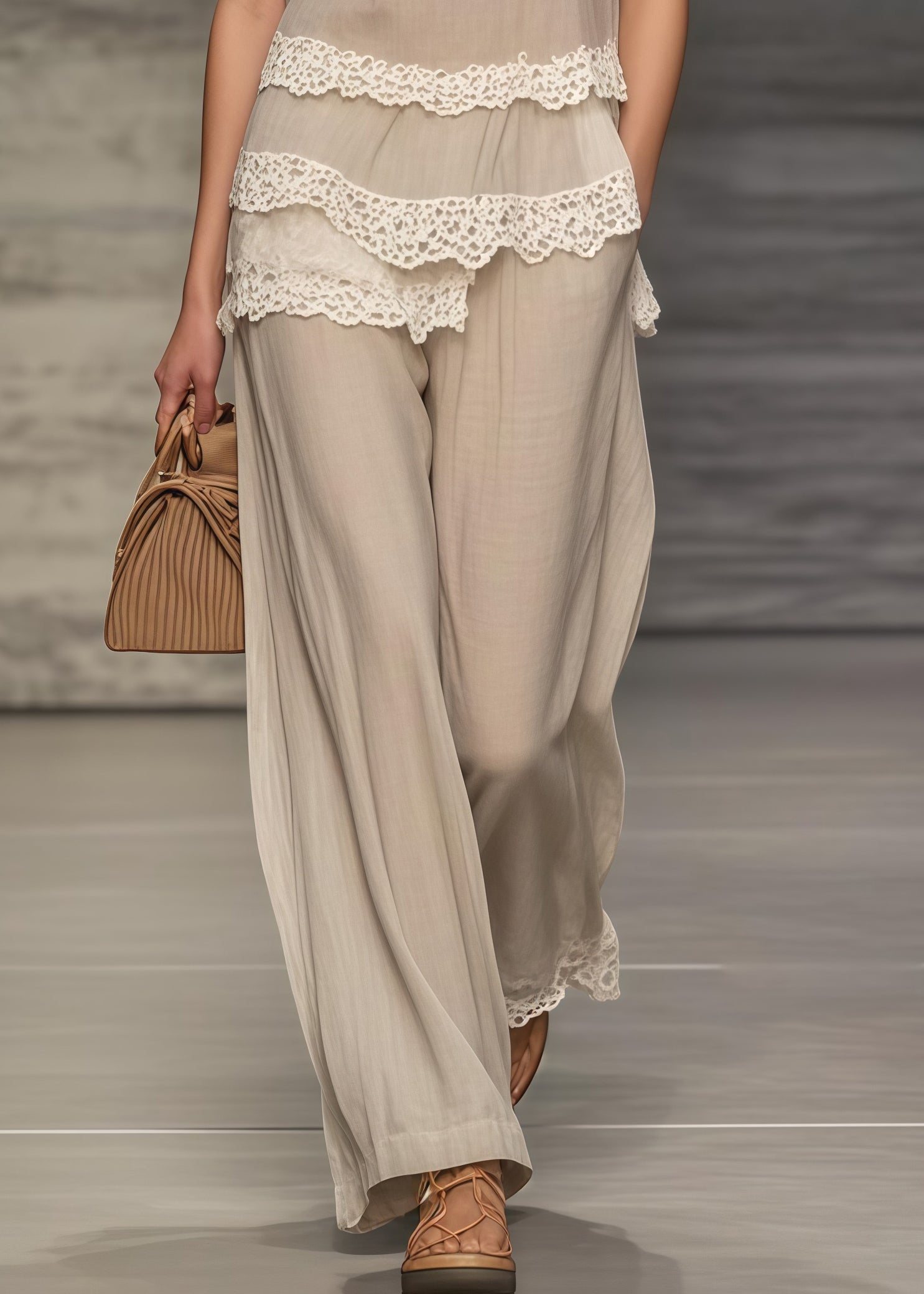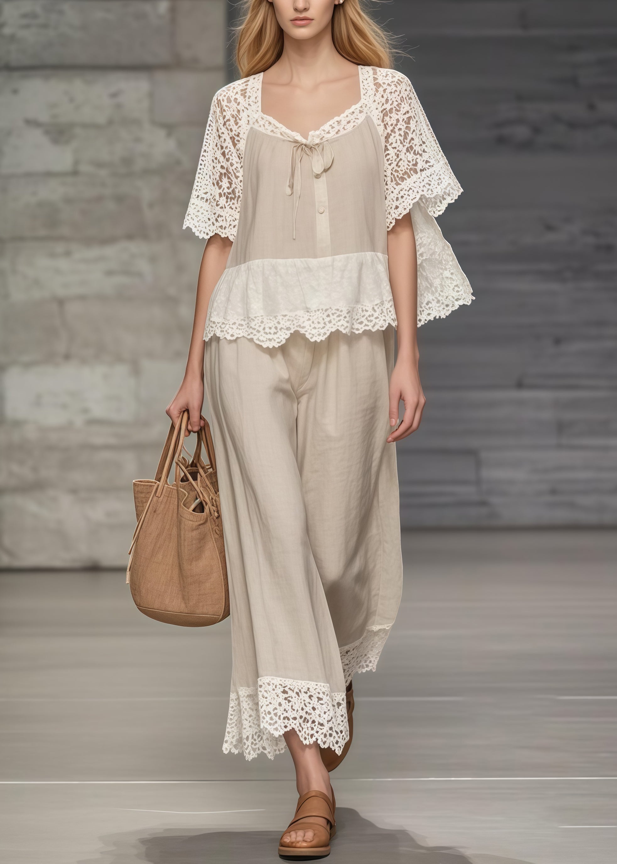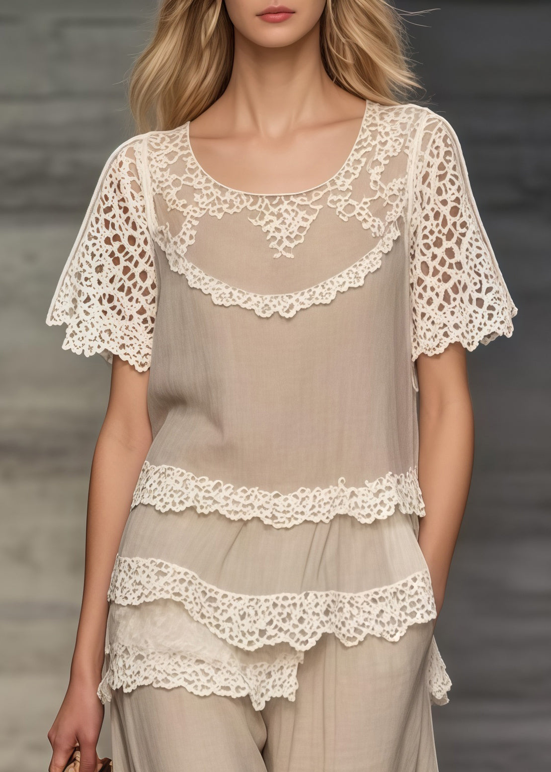 Fine Khaki Square Collar Lace Patchwork Hollow Out Two Pieces Set Summer