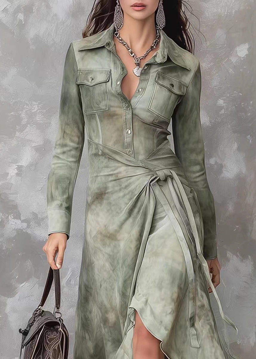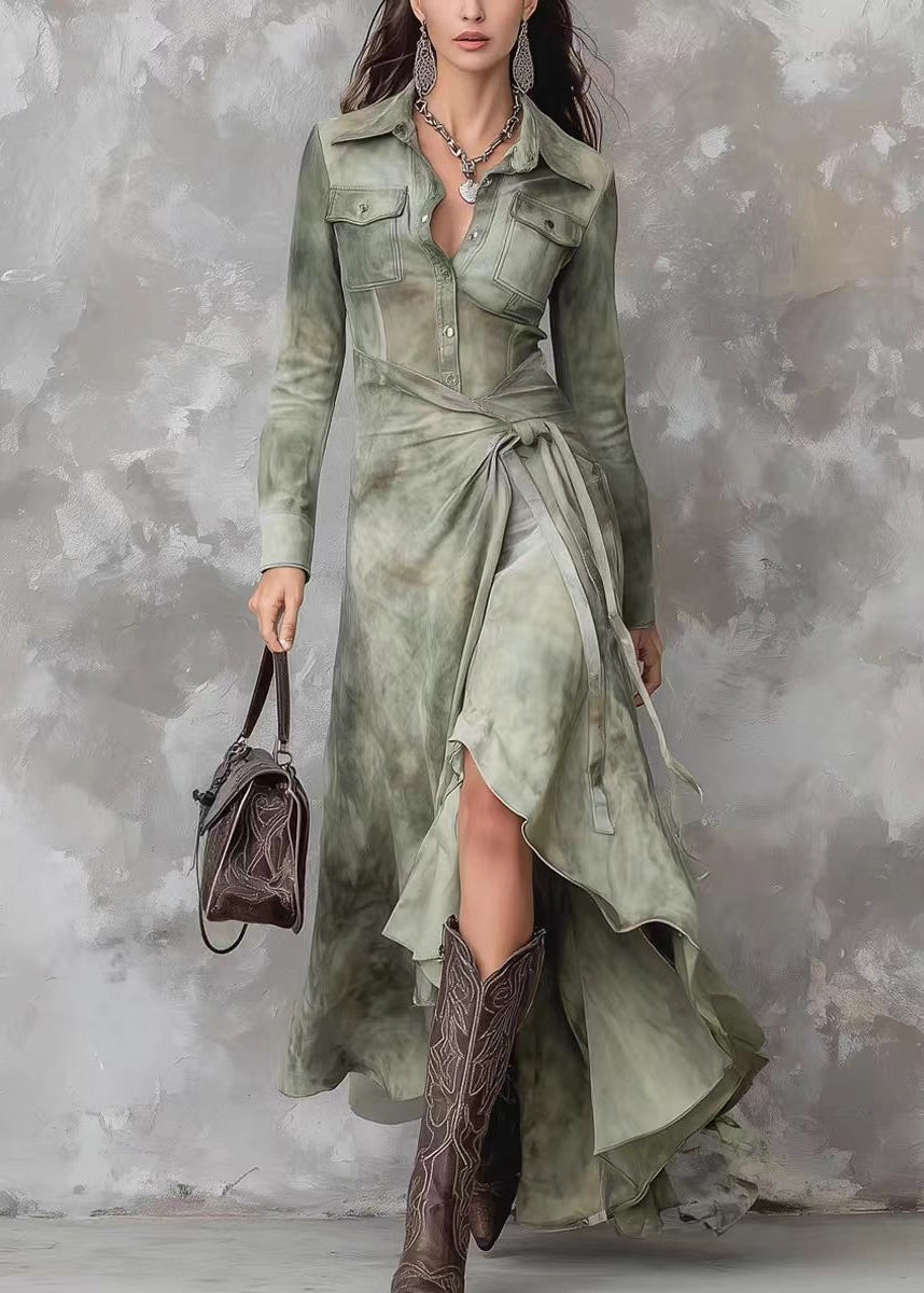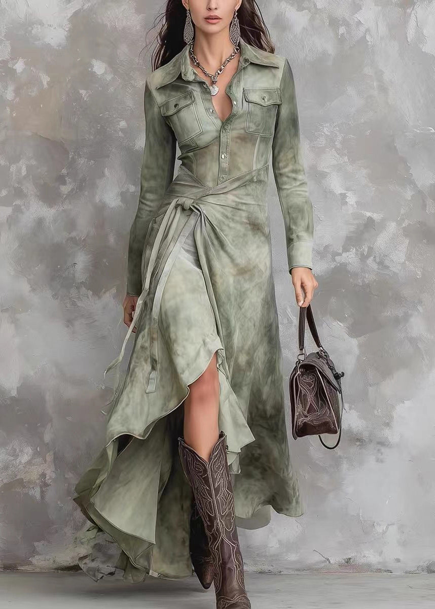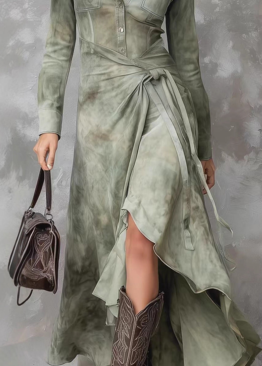 French Green Peter Pan Collar Tie Dye Lace Up Maxi Dresses Spring