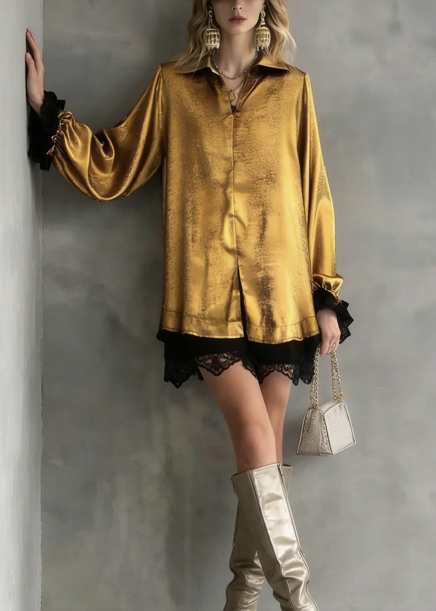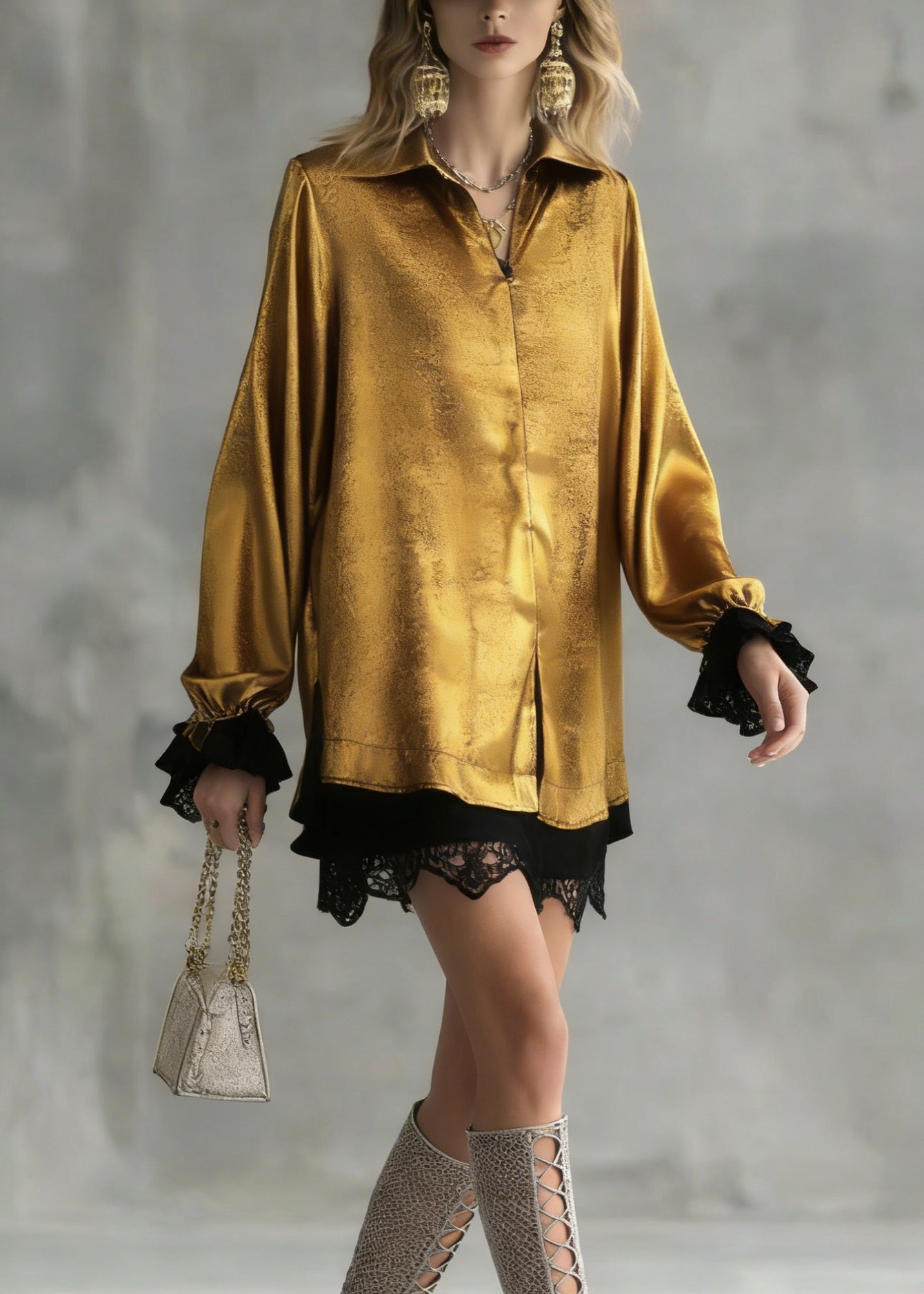 New Yellow Peter Pan Collar Lace Patchwork Silk Top Spring