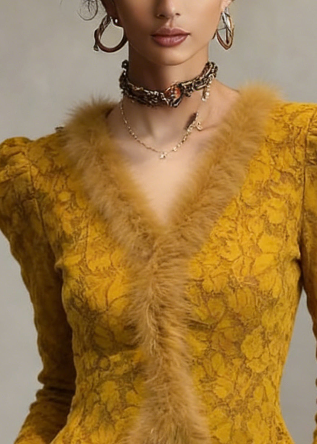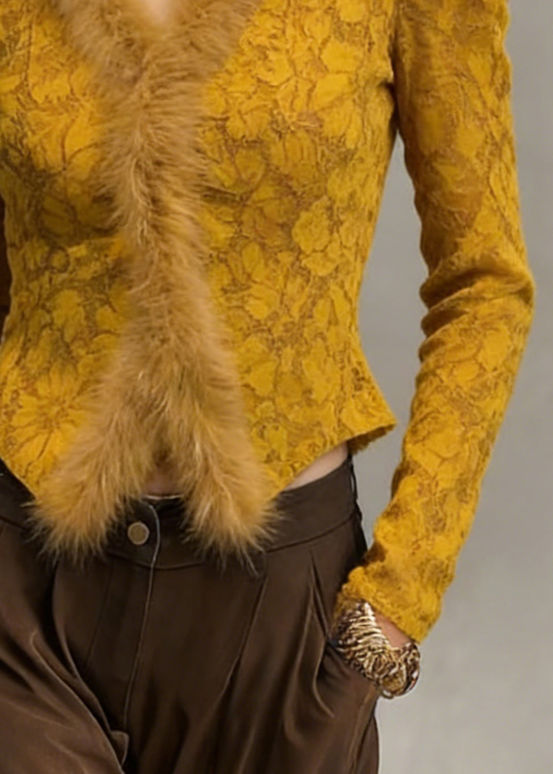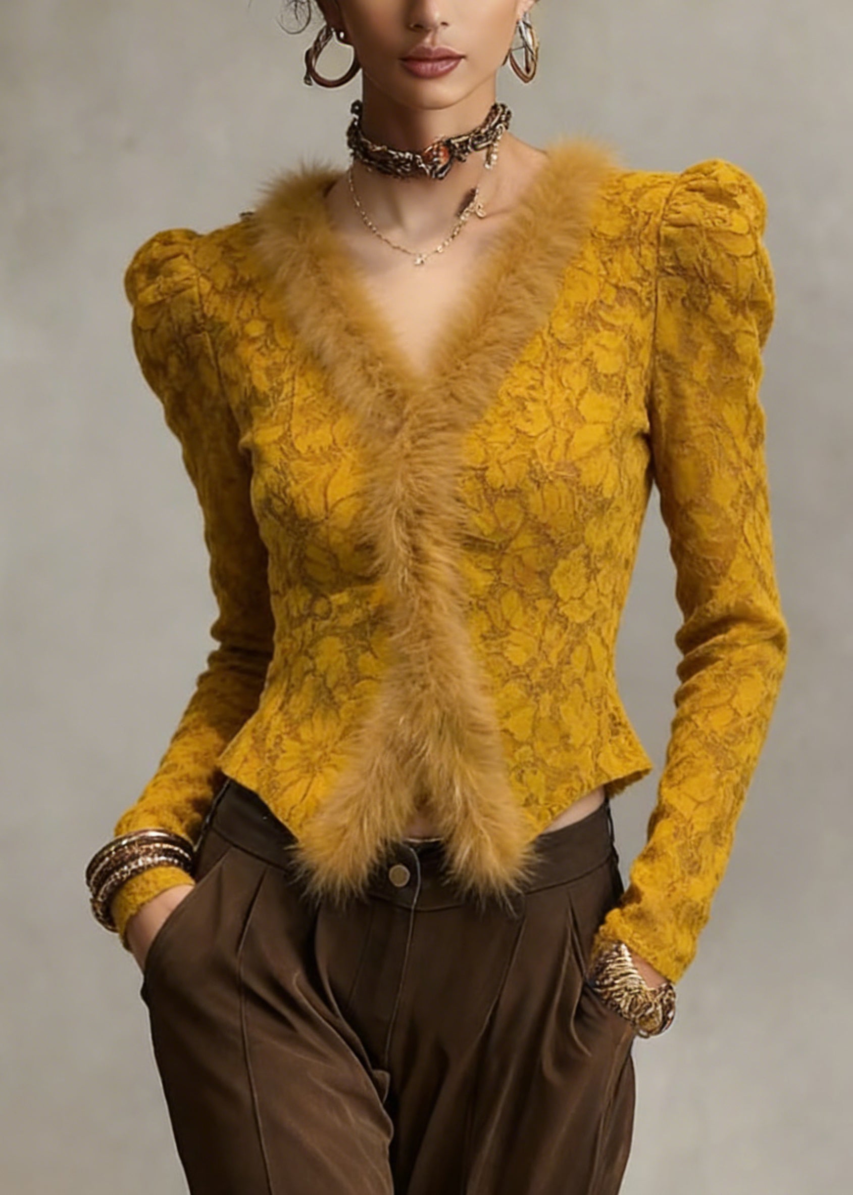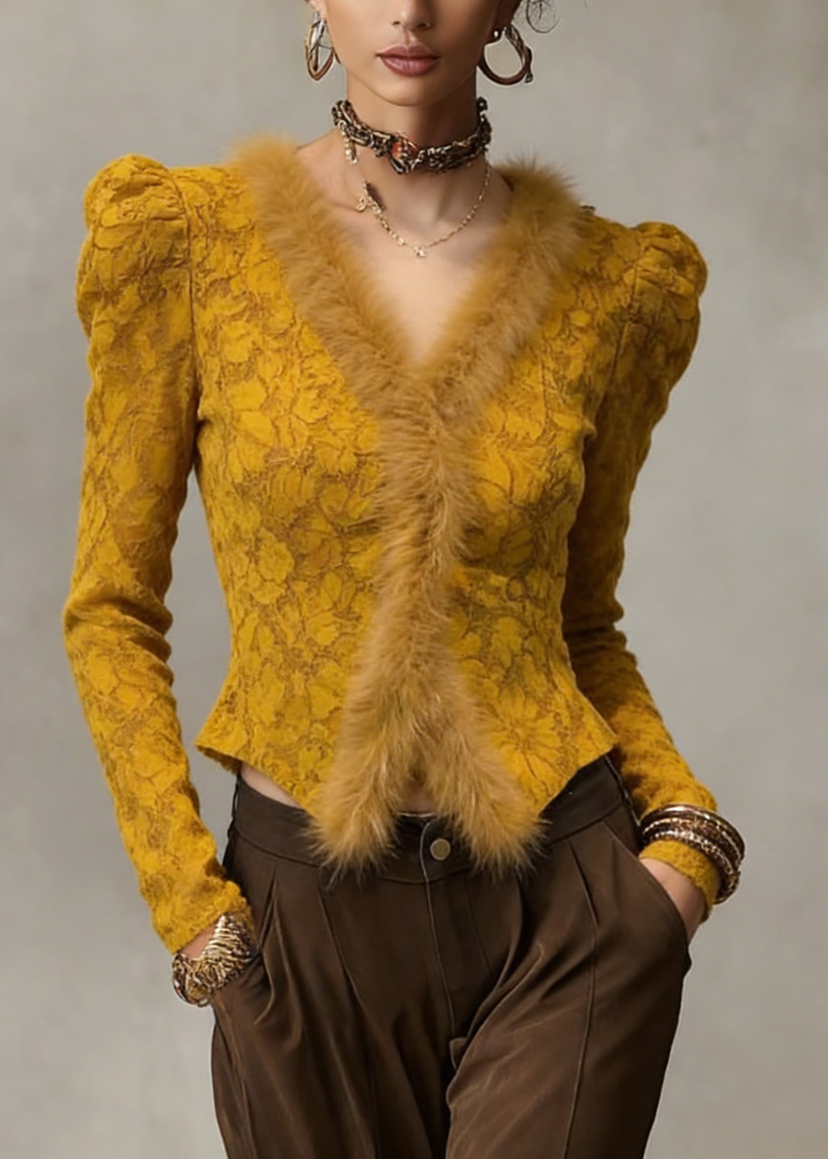 Slim Fit Yellow V Neck Lace Fluffy Patchwork Warm Fleece Tops