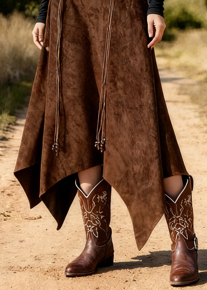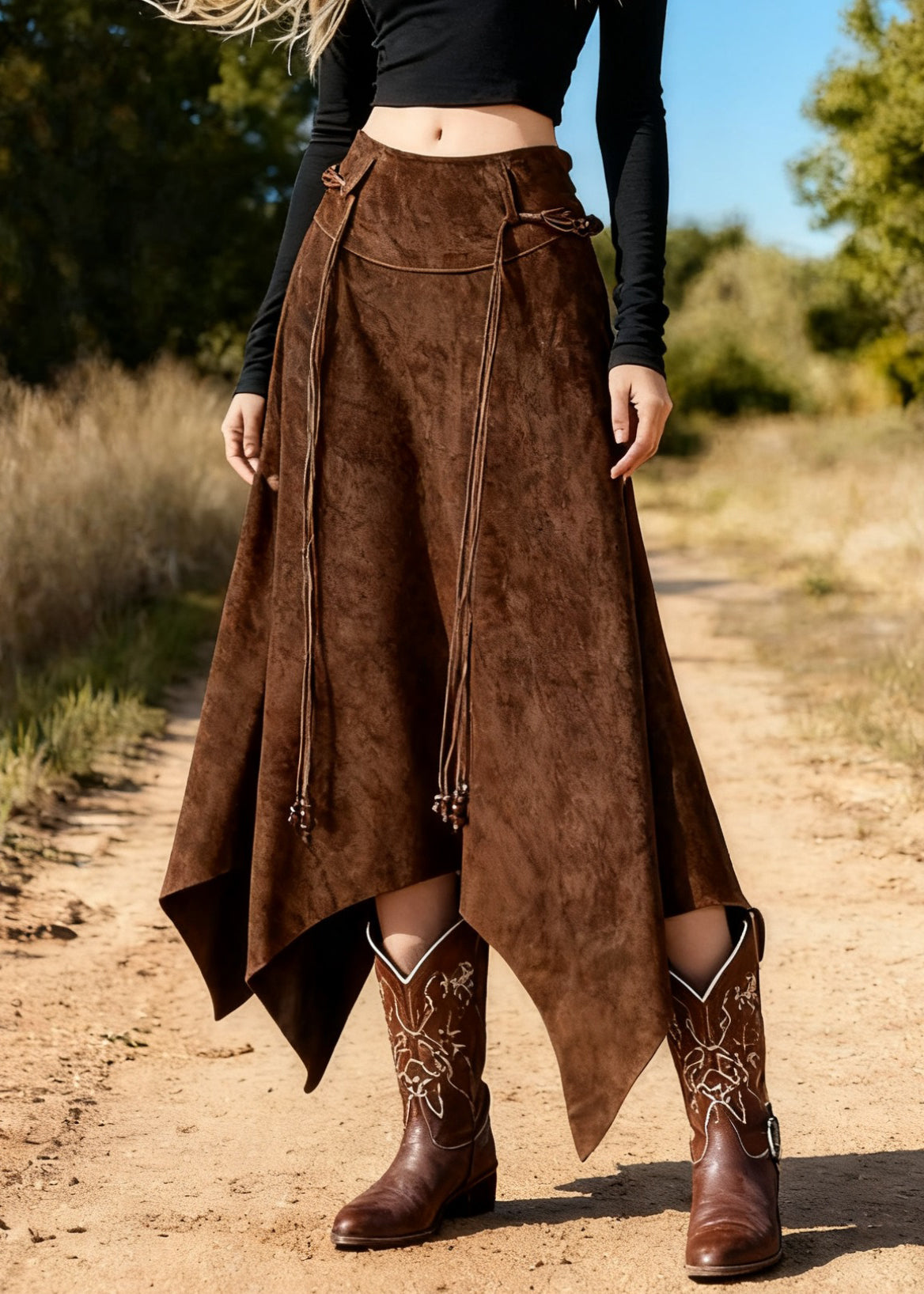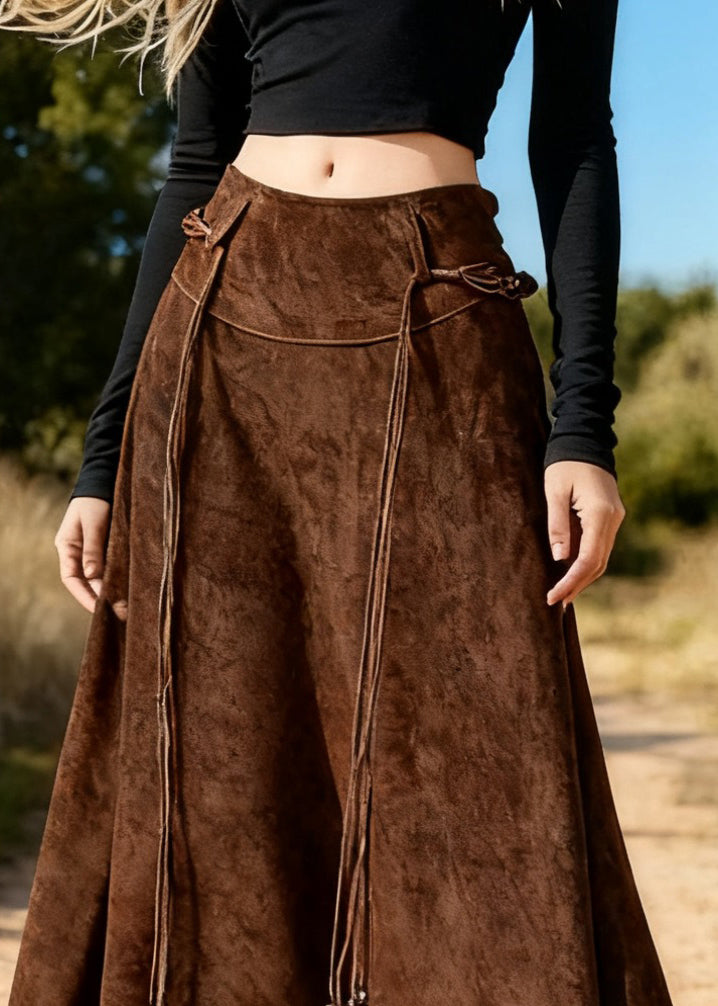Vintage Coffee Asymmetrical Lace Up High Waist Faux Suede Skirts Spring