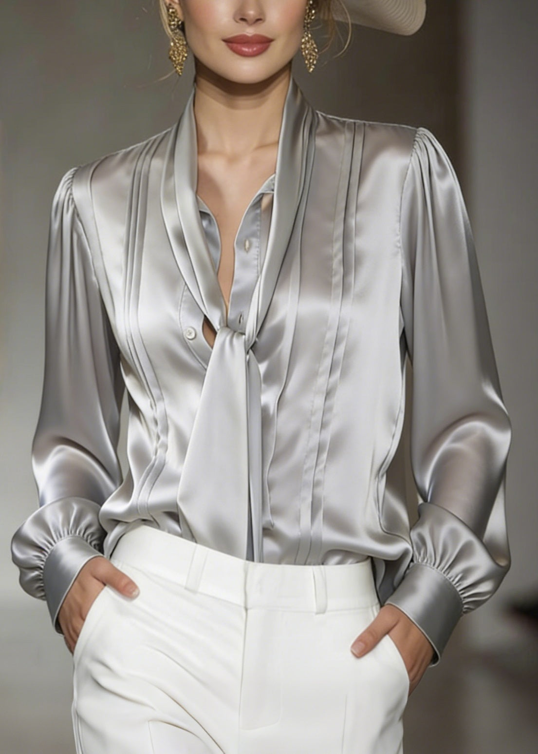 Women Classy Grey Lace Up Wrinkled Silk Blouses Spring