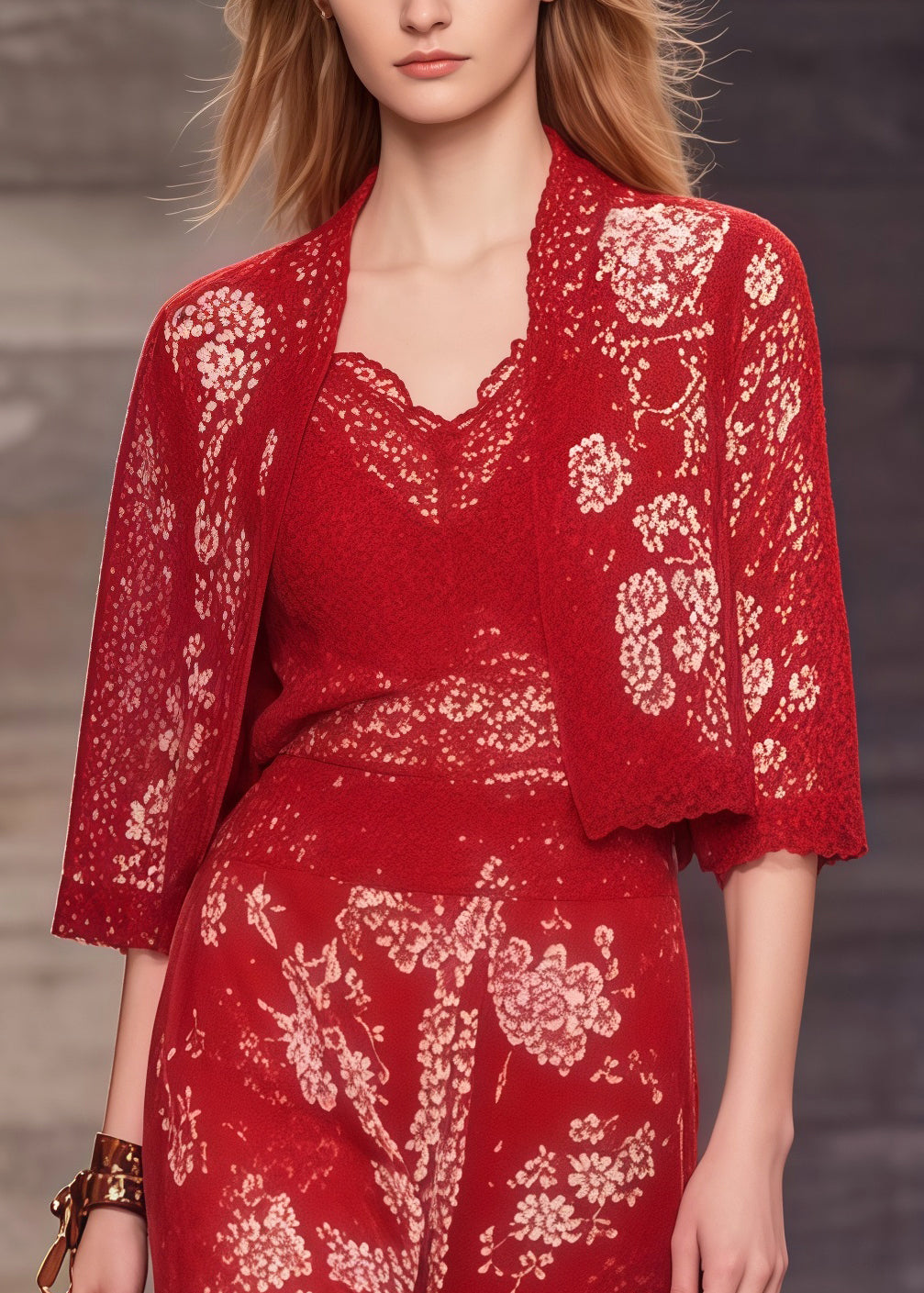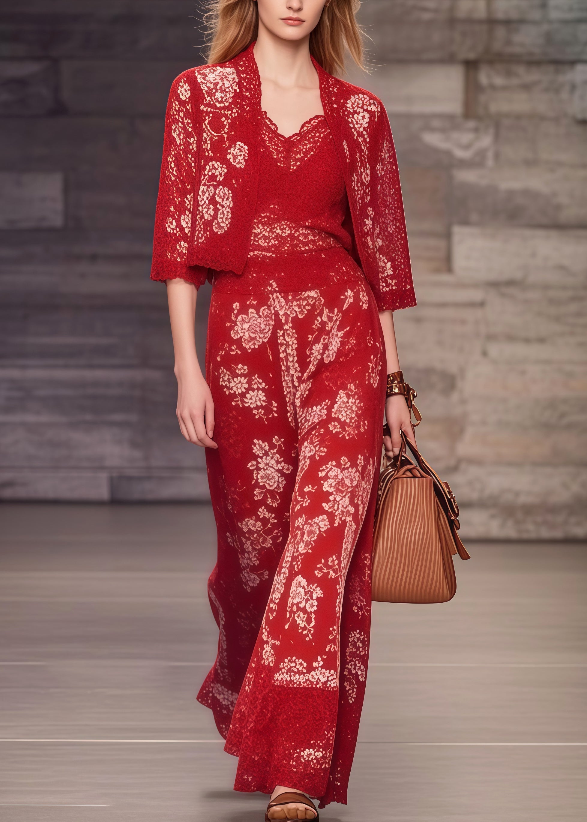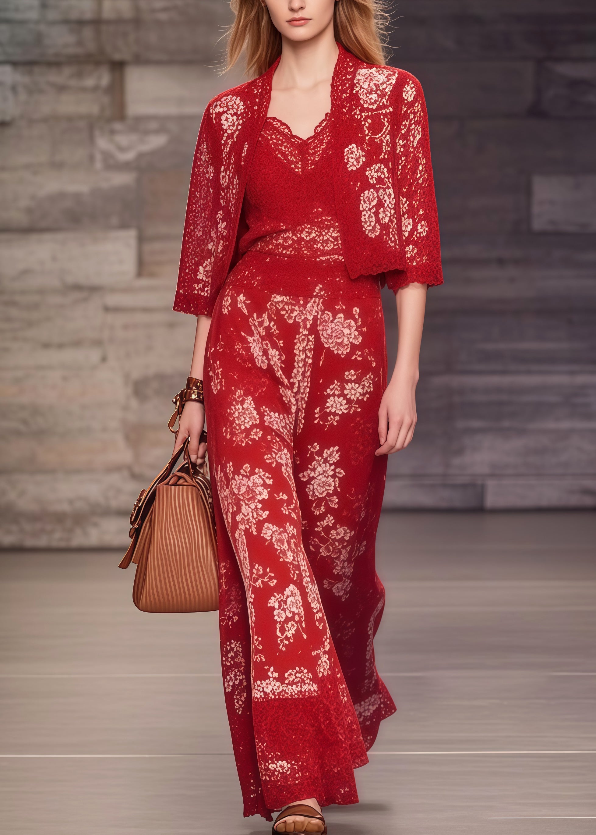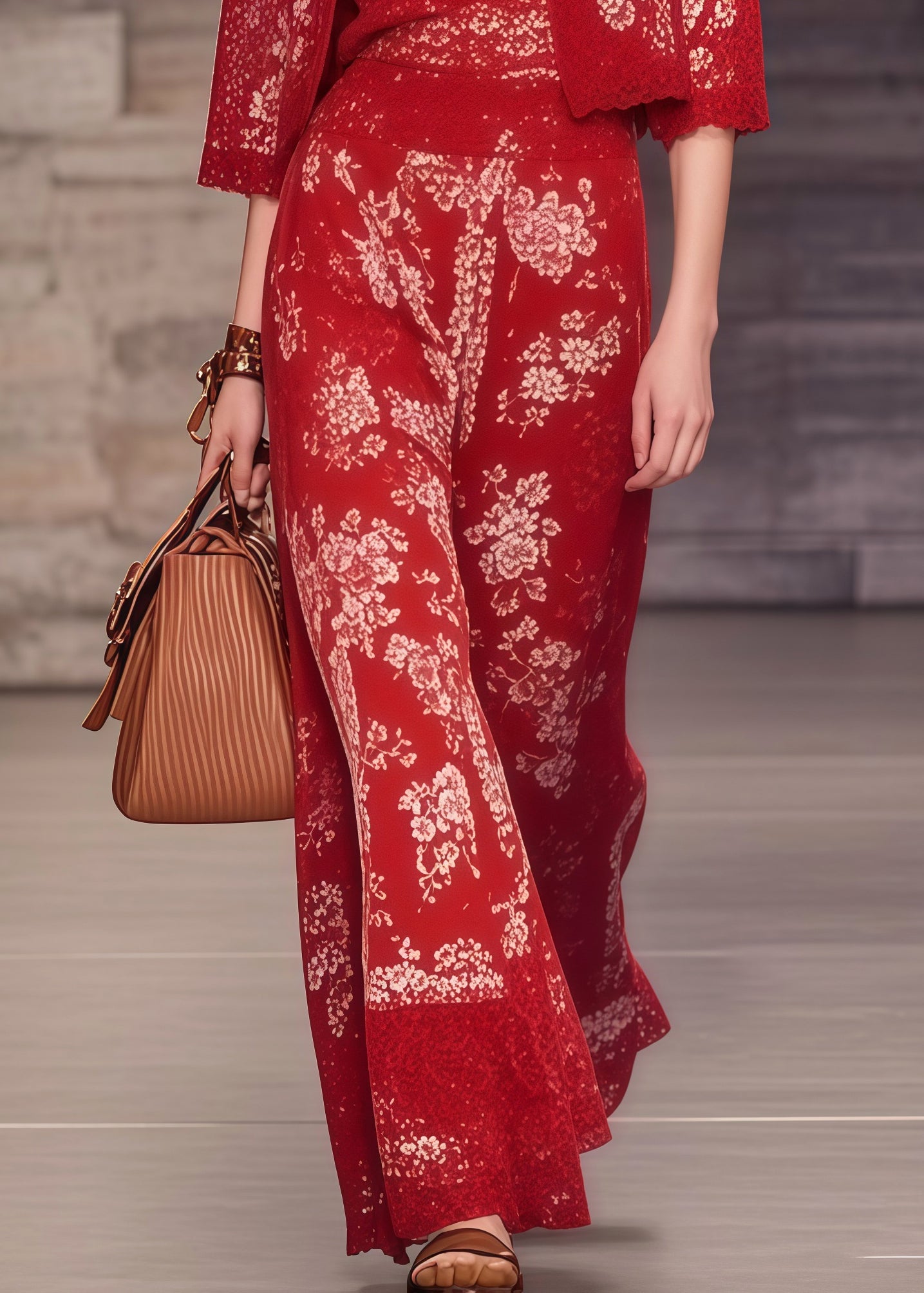 Women Red Print Lace Patchwork Spandex Two-Piece Set Summer