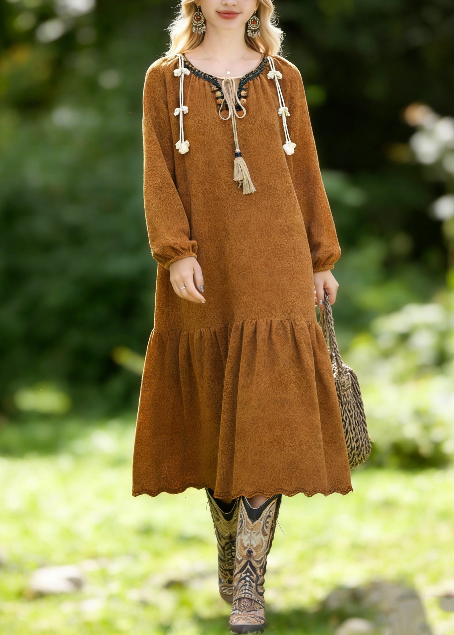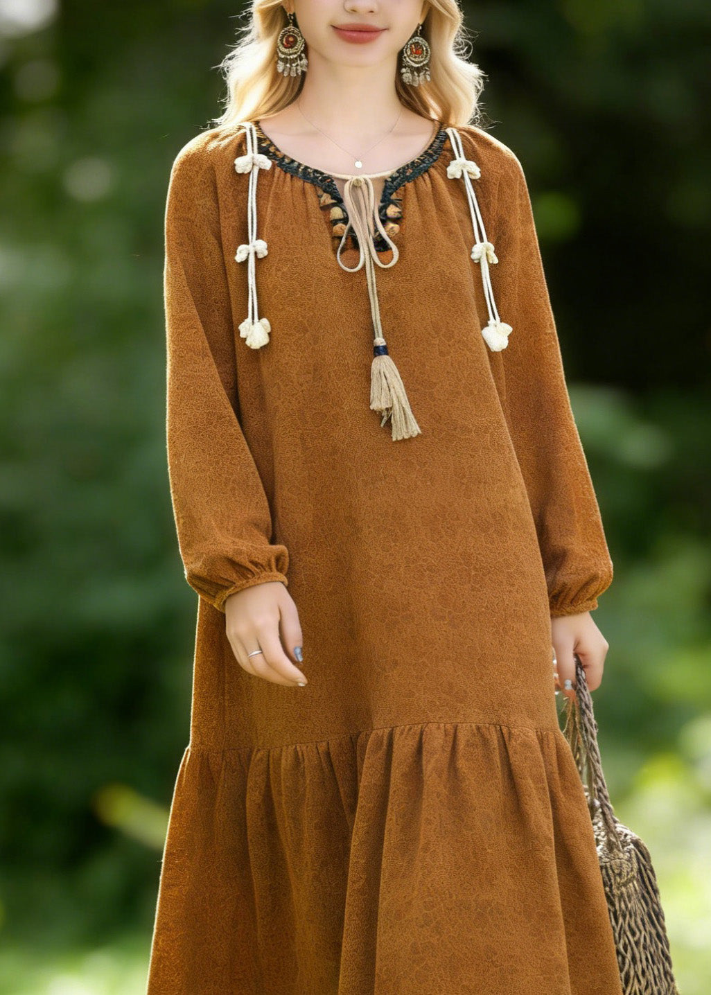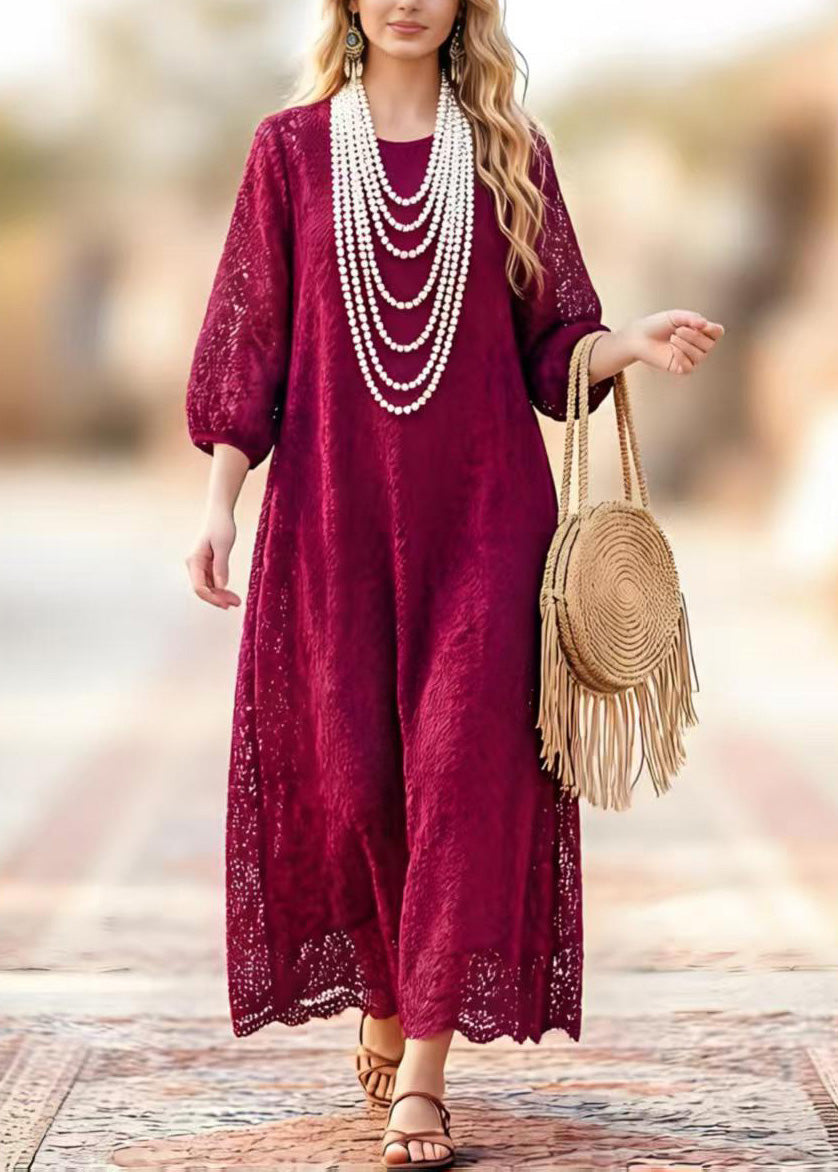 Boho Brown O Neck Jacquard Lace Vacation Dresses Spring