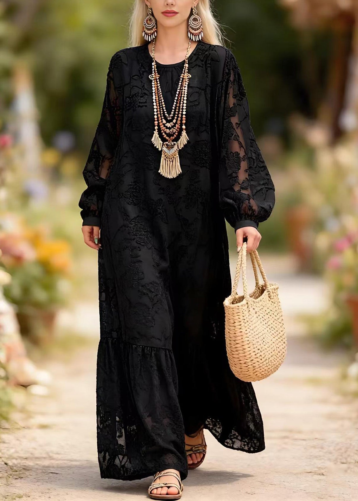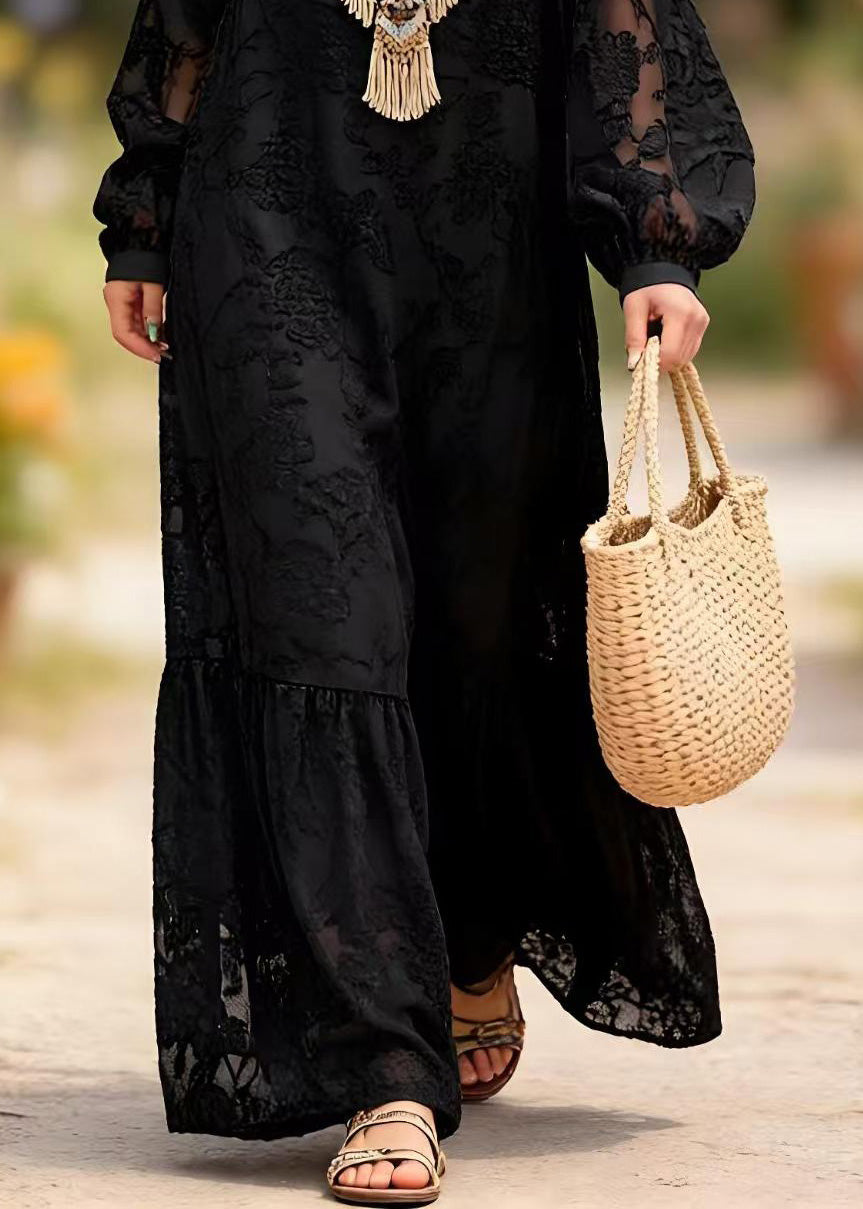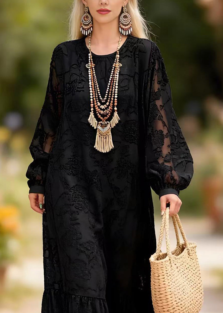 Chic Black O Neck Embroidered Lace Long Dress Spring
