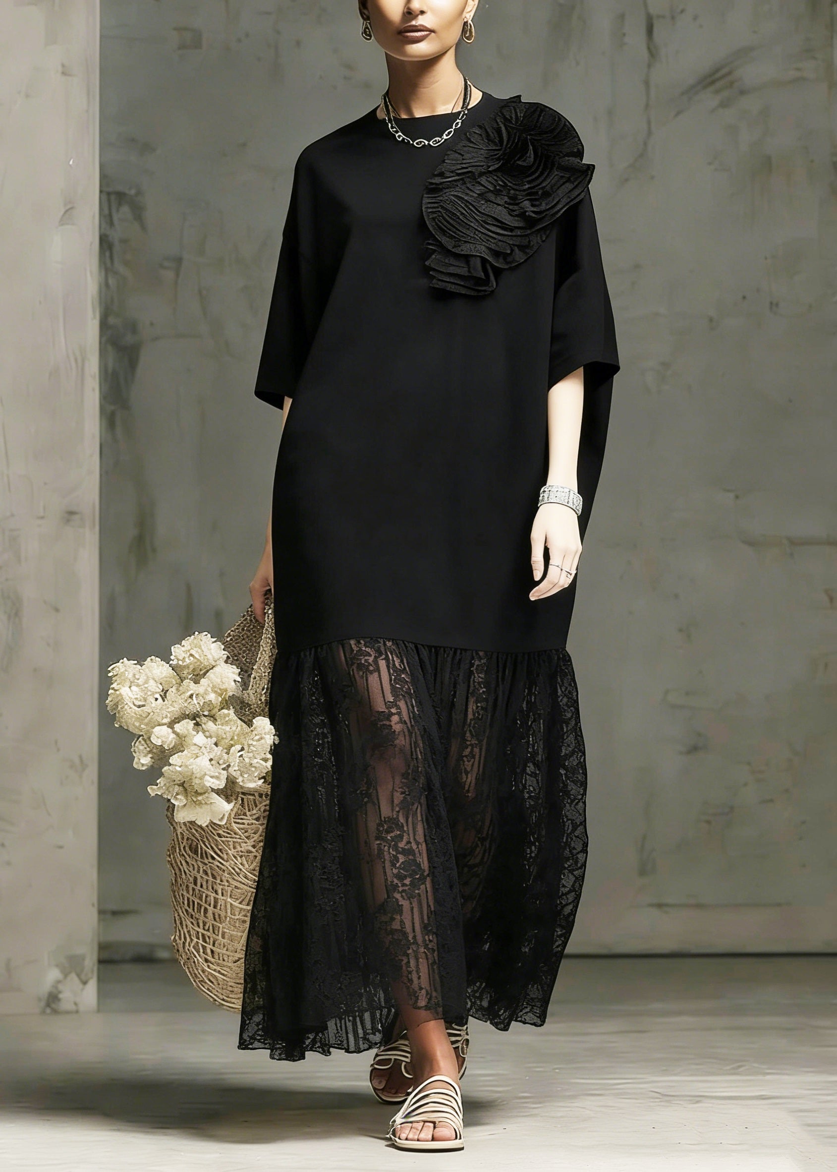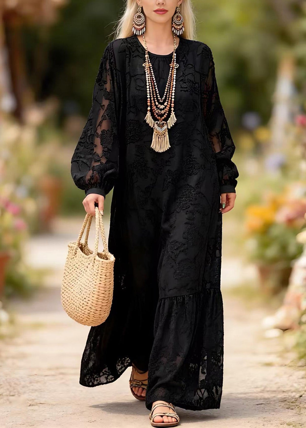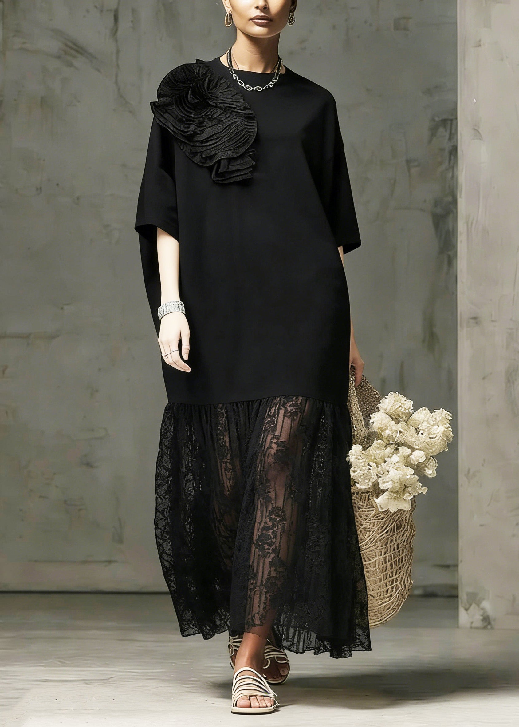 Chic Black O Neck Embroidered Lace Long Dress Spring