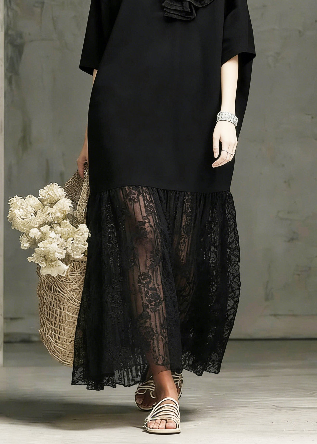 Boutique Black O Neck Floral Lace Patchwork Cotton Dress Summer