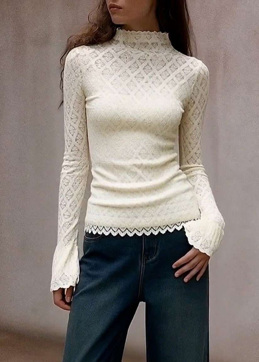 French White Turtleneck Solid Lace T Shirts Flare Sleeve