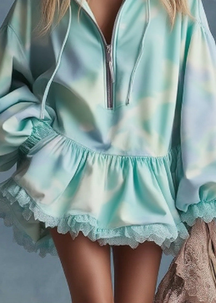 Stylish Zip Up Lace Patchwork Cotton Sweatshirt Streetwear Dress Spring