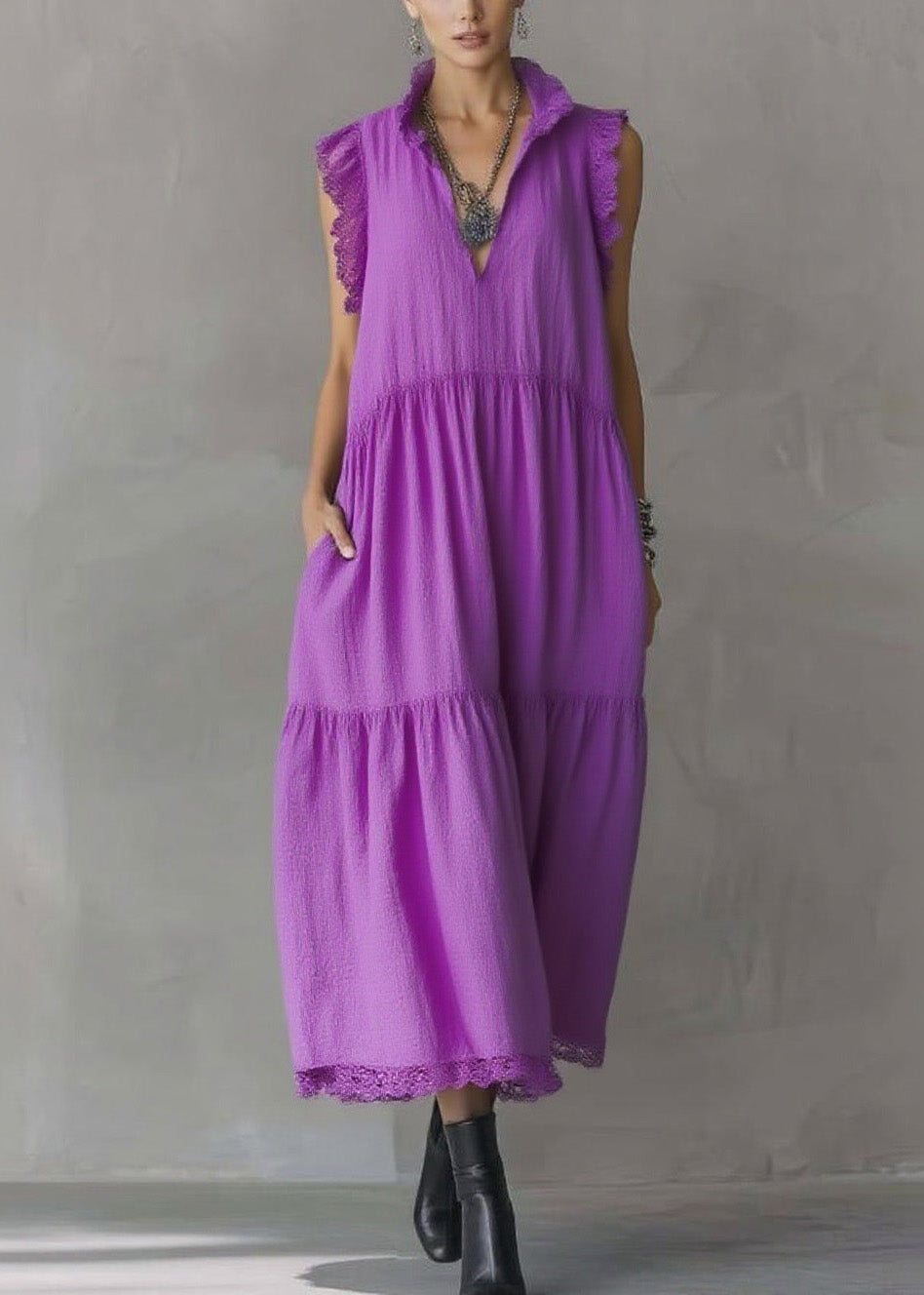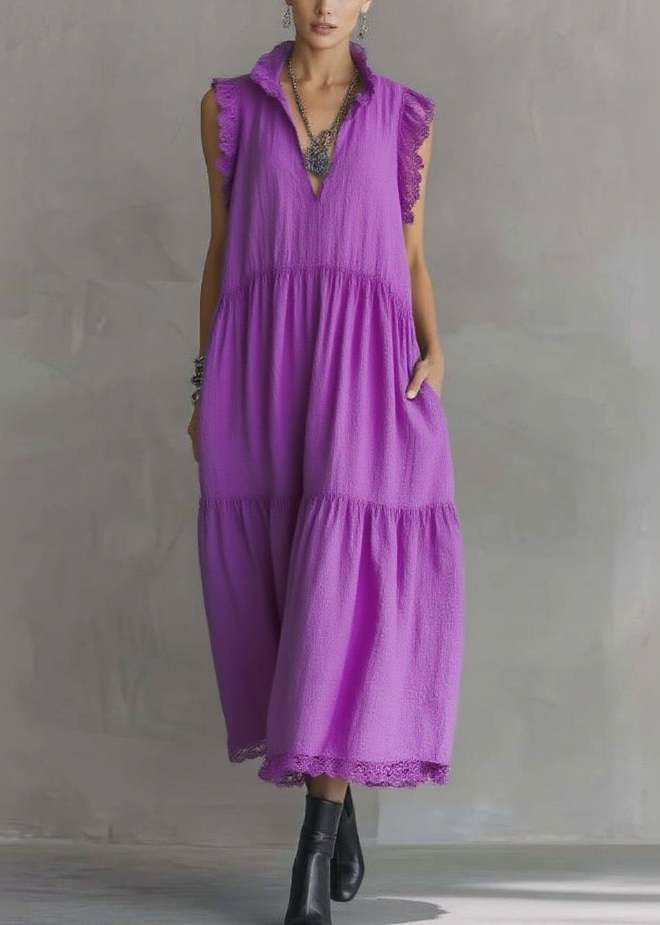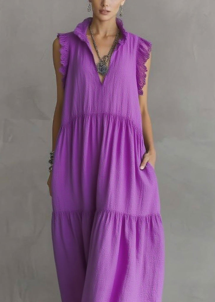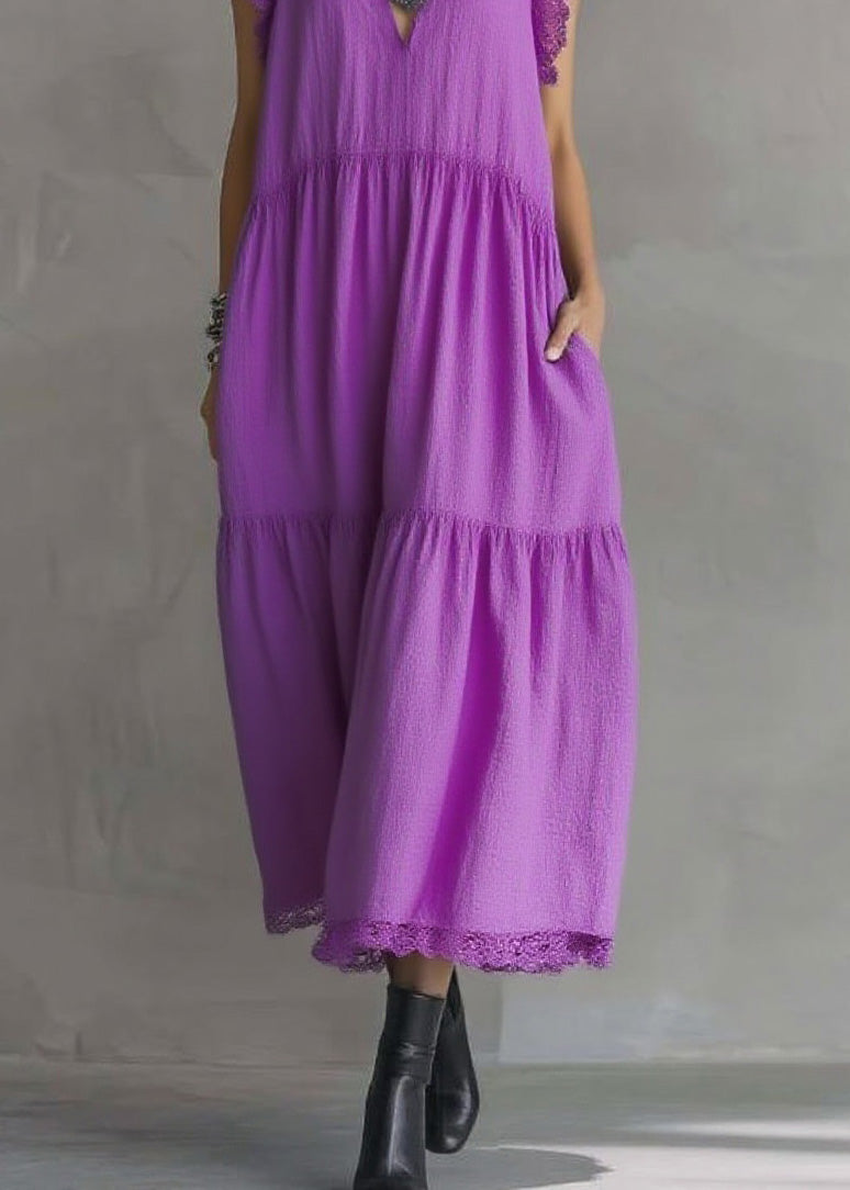 Women Purple Ruffled Lace Patchwork Cotton Dresses Sleeveless