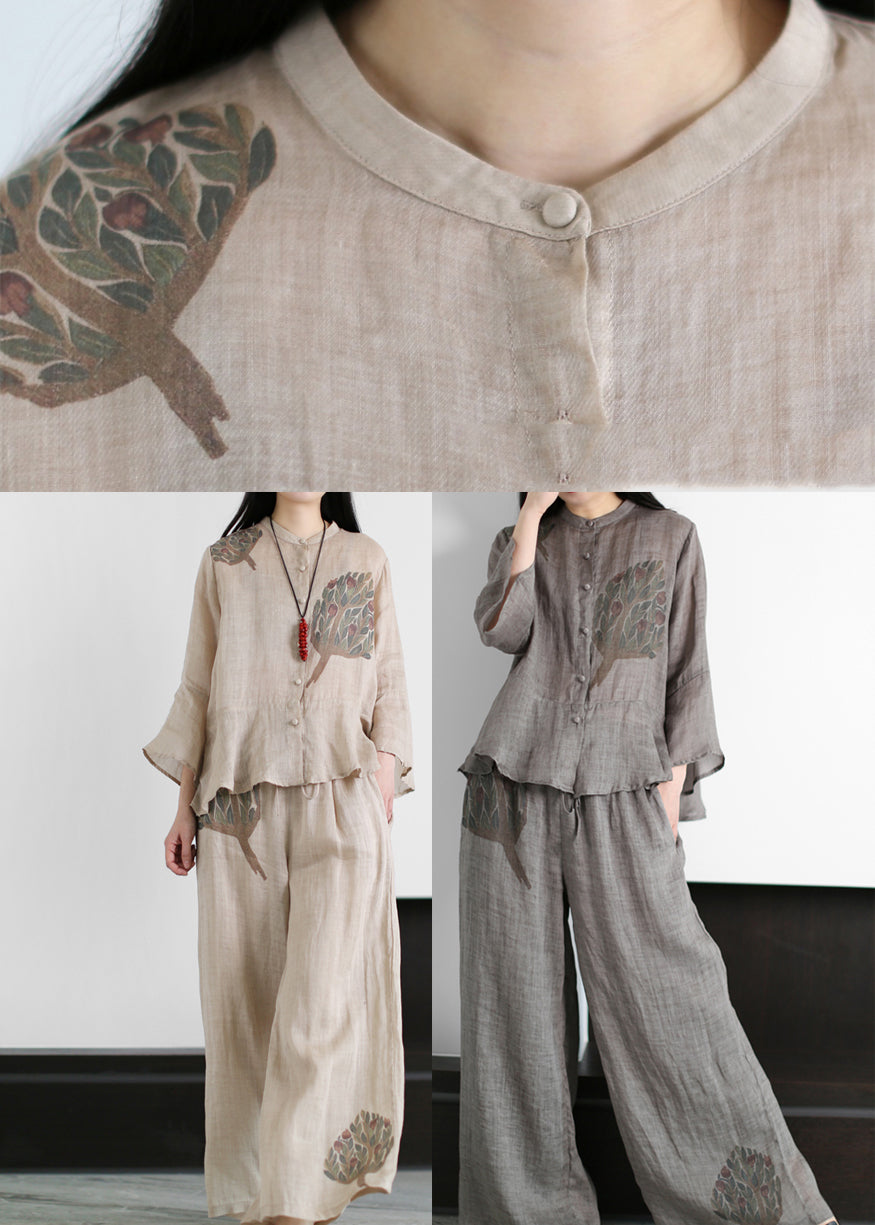 Apricot Pocket Linen Tops And Wide Leg Pants Two Piece Set Women Clothing Ruffles flare sleeve