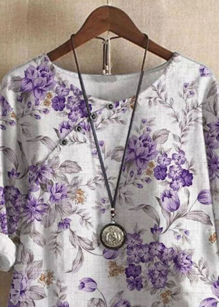 Women Purple O Neck Print Patchwork Linen T Shirts Tops Summer