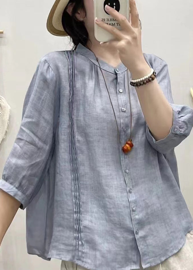 French Linen Embroidered Button Cotton Blouses Half Sleeve