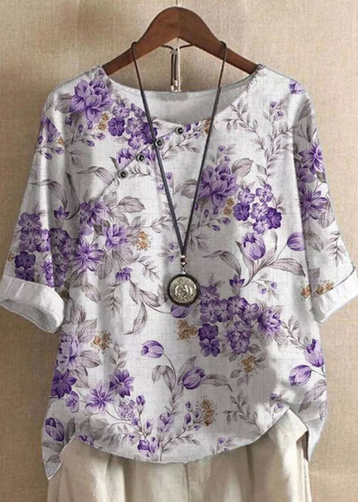 Style Blue Oversized Floral Linen Shirt Tops Spring