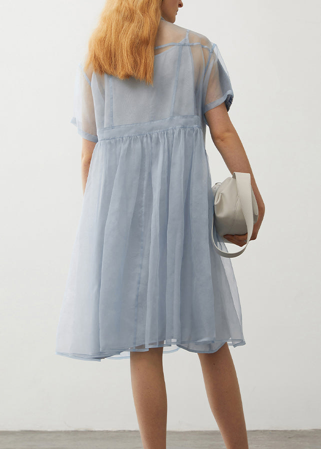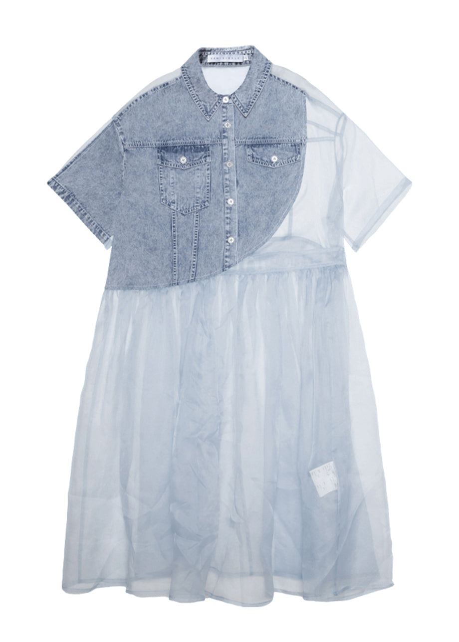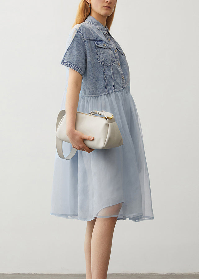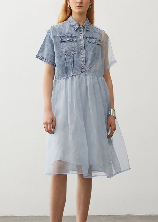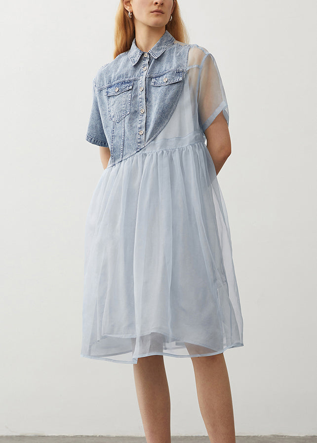 Original Design Light Blue Peter Pan Collar Denim Patchwork Silk Dress Summer