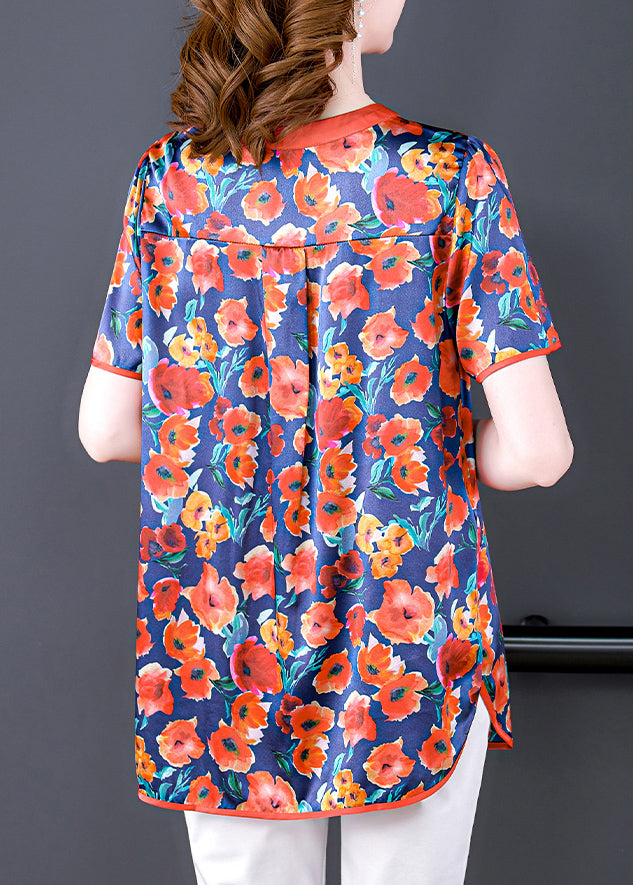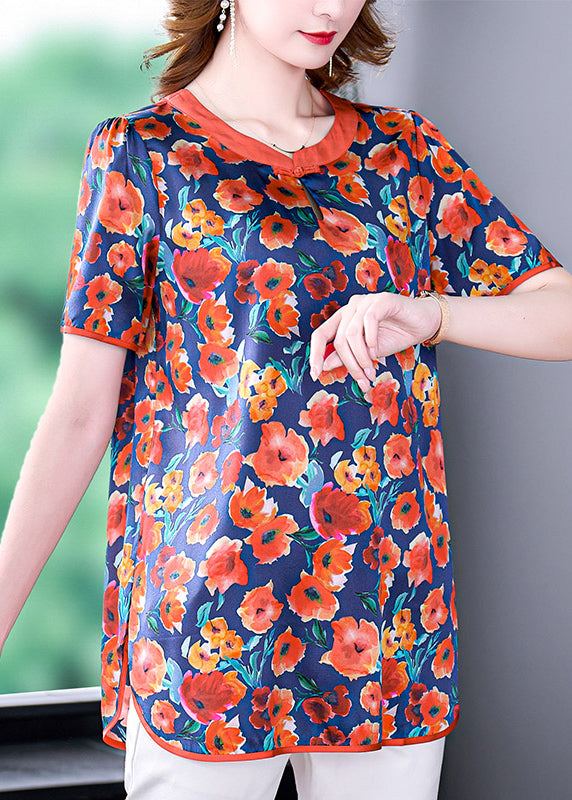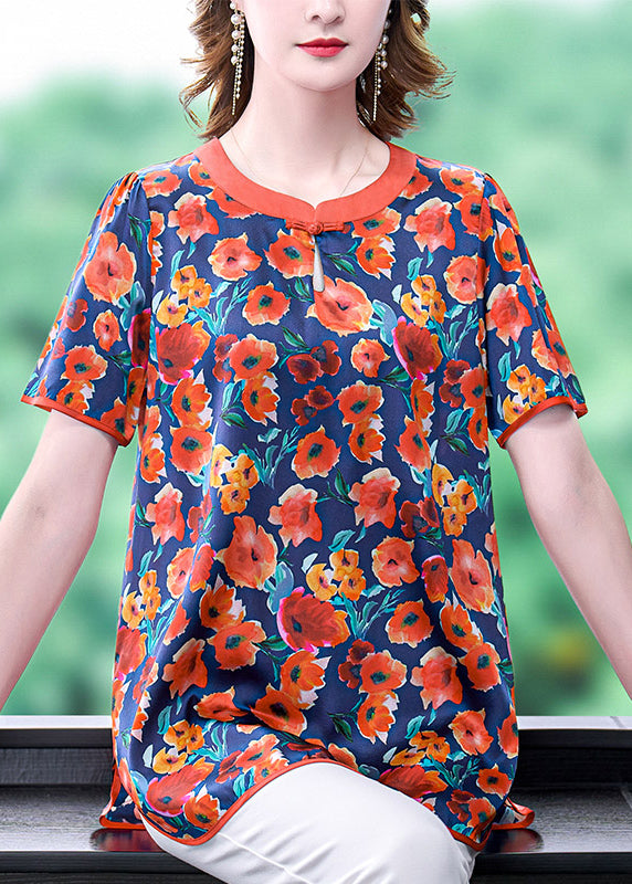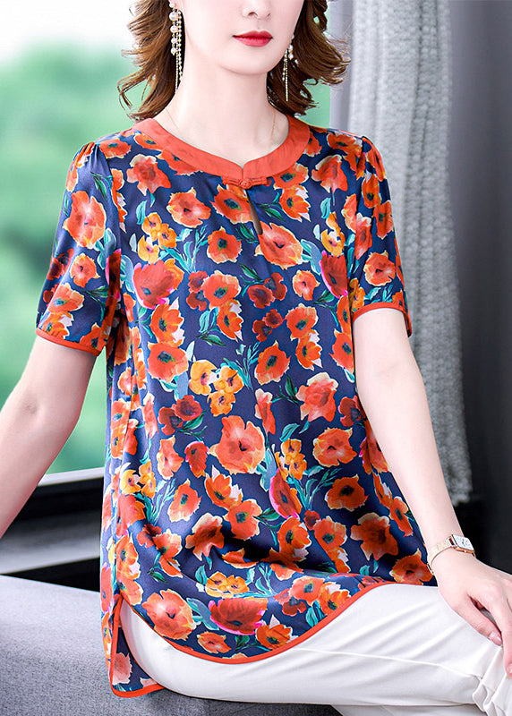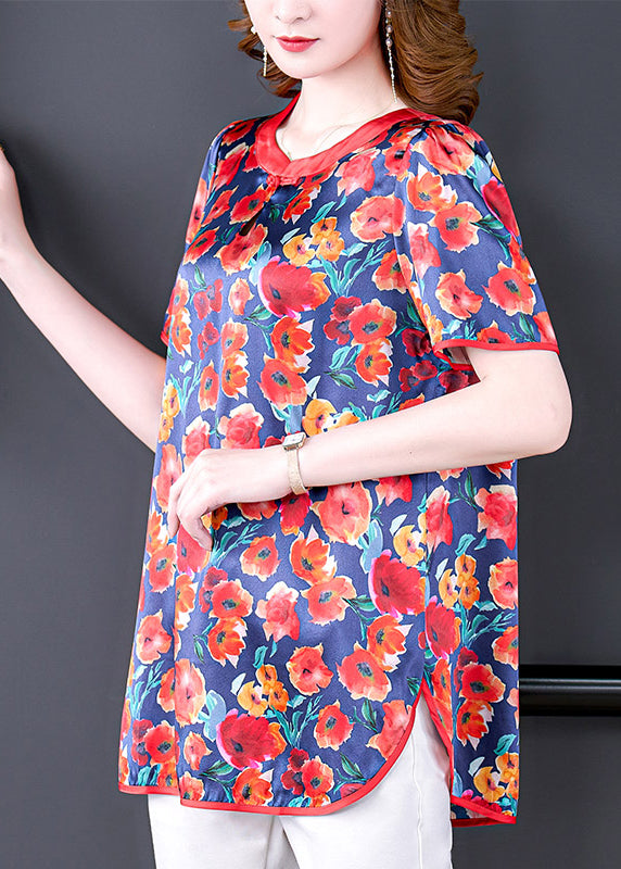 Boutique Red O-Neck Oriental Button Floral Print Silk Tank Short Sleeve