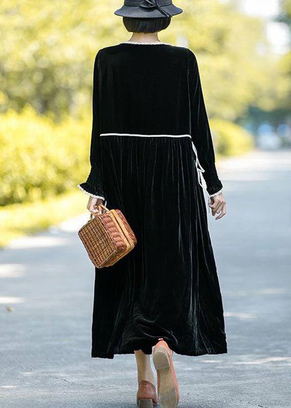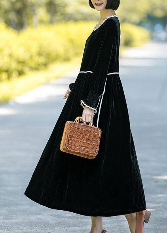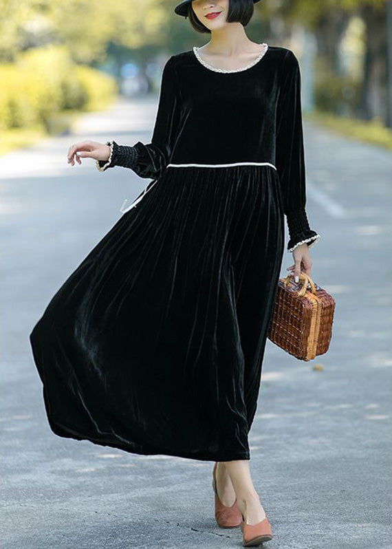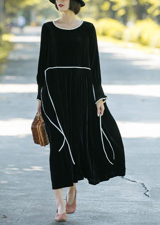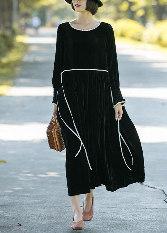 Brief Black O-Neck Patchwork Silk Velour Long Dresses Long Sleeve